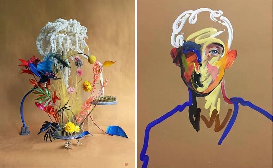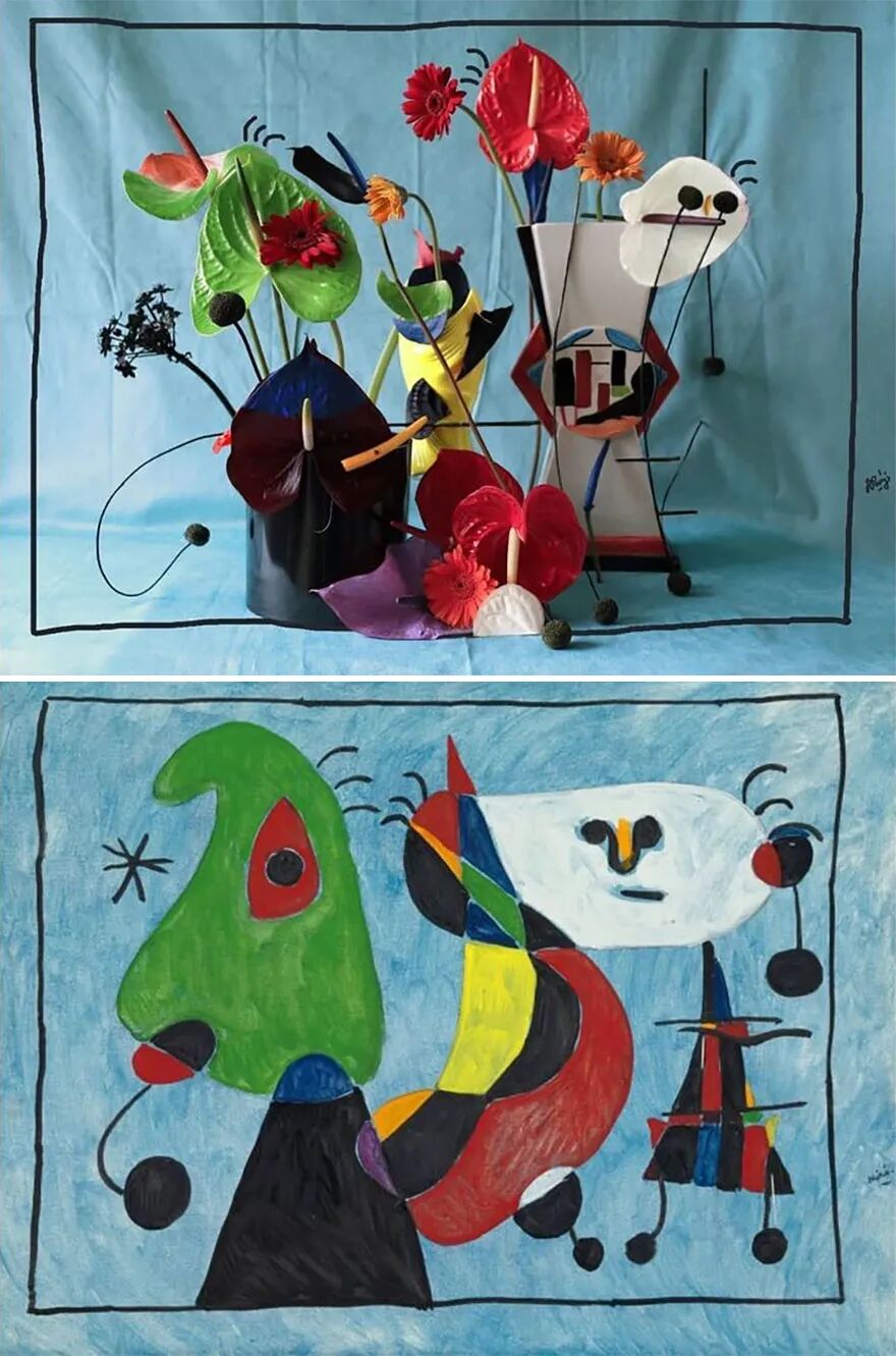 仅用鲜花、花盆以及一些小的配件,来创建线条、形状和形式,是一个不小的挑战,不仅色彩要匹配,还要与原作形成呼应或者搭配,氛围感也很重要,让人一眼看上去,就能感受到二者的和谐,哈里特·帕里付出了不小的努力。