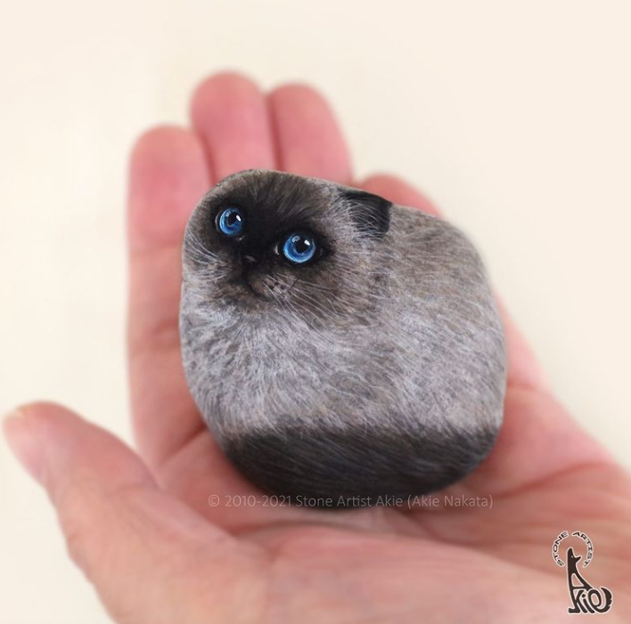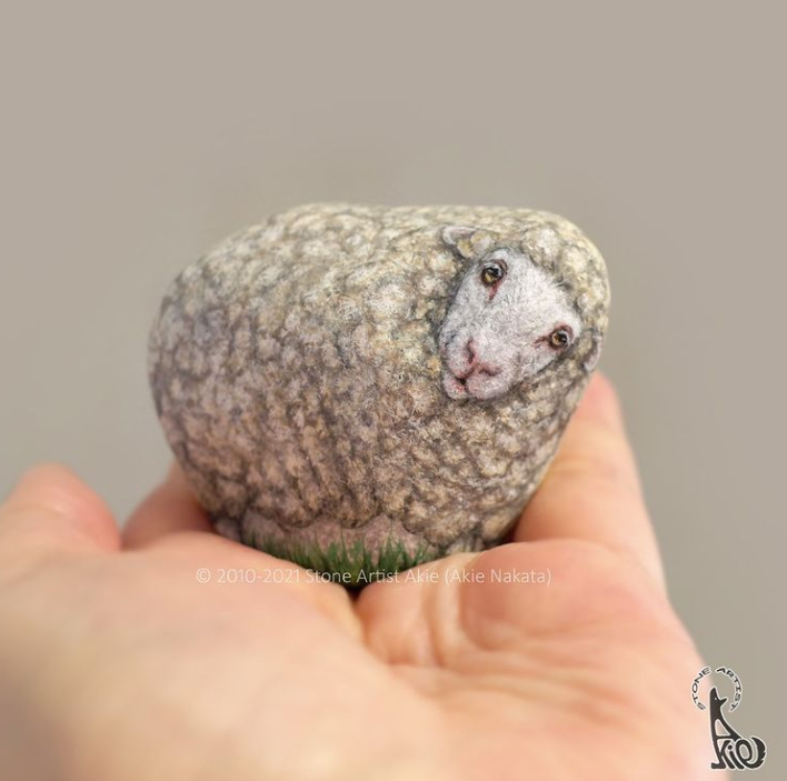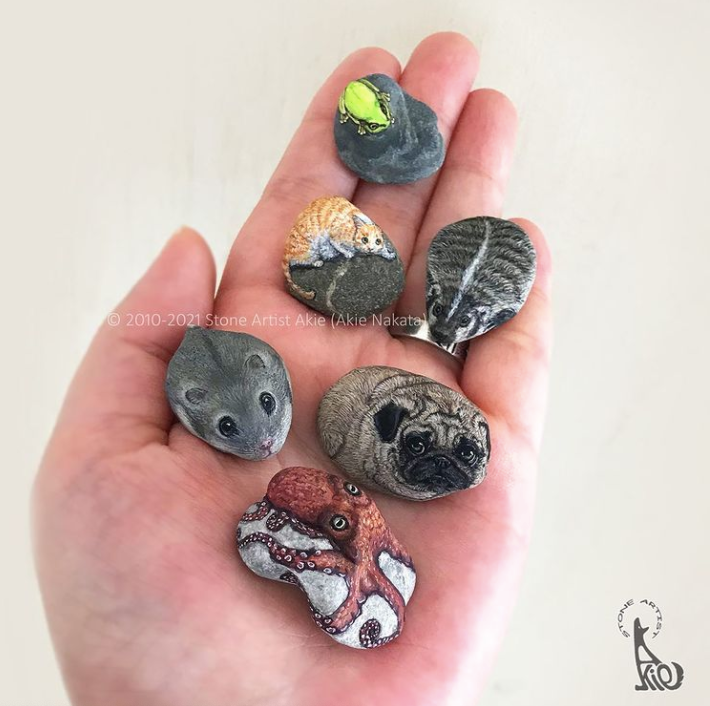 一块普通的石头,加上一支水彩笔和一盒丙烯颜料,中田昭惠就可以产出一只可以放在手中的动物,石头的缺陷也被她充分的利用起来,衍生出非常具有想象力的作品。