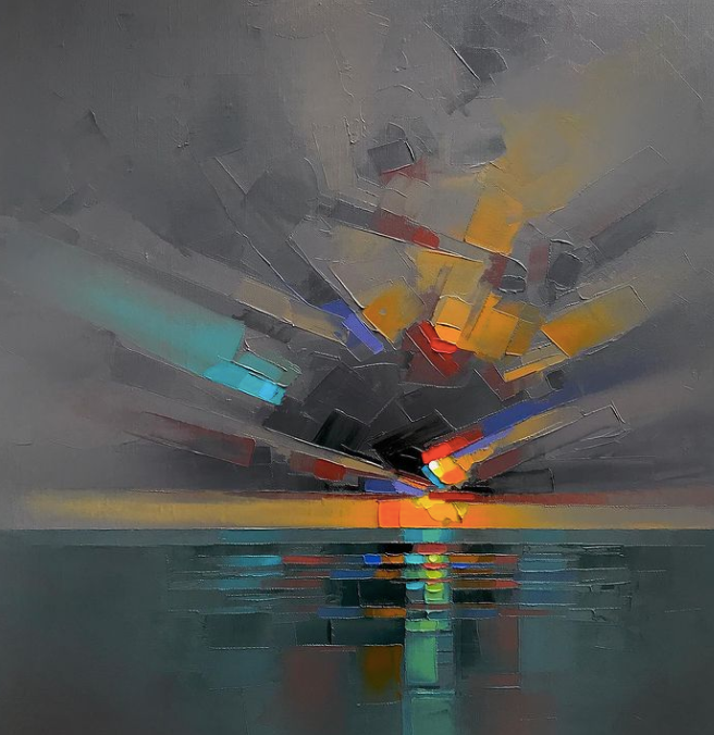 杰森·安德森的调色刀画还有一个很大的特点,如果你仔细观察他的作品就会发现,每一幅抽象画中都有一个中心点,这个点能一下子就吸引人的关注,它似乎在画布上闪闪发光,照亮了周围柔和又朦胧的色彩。