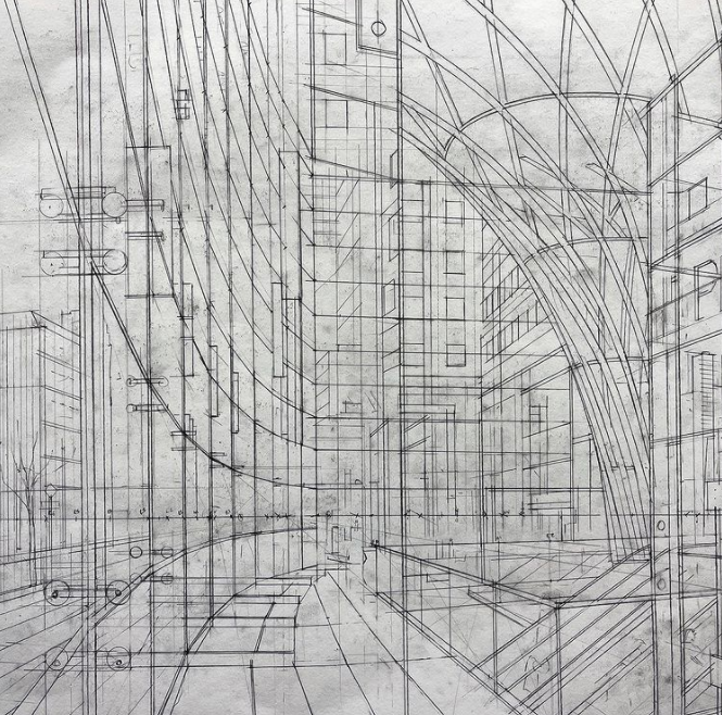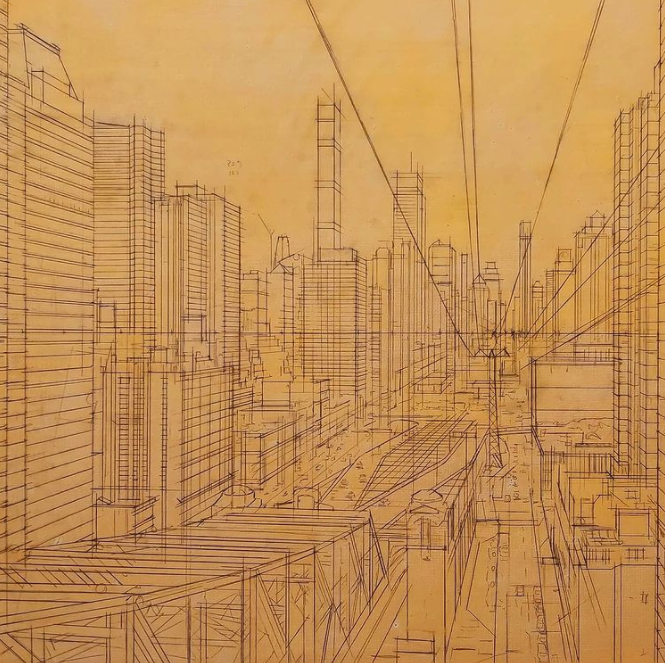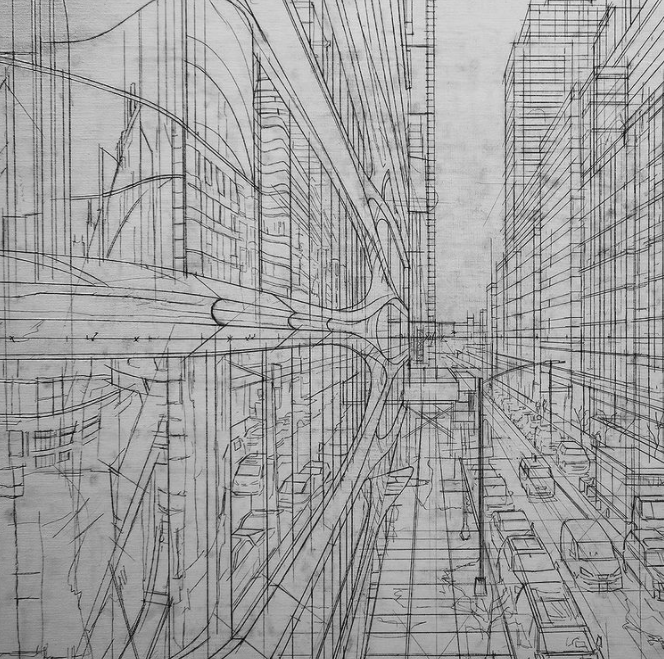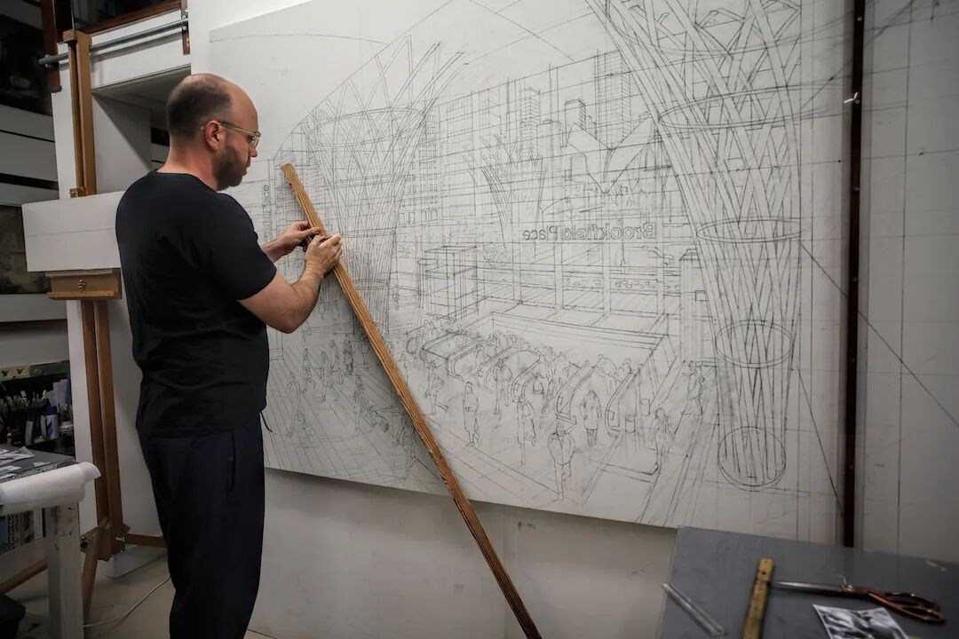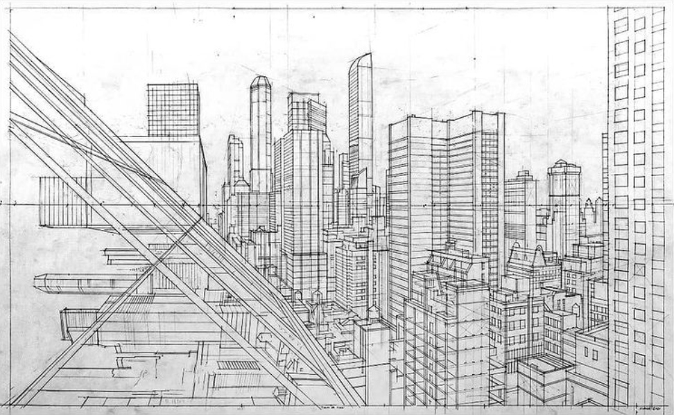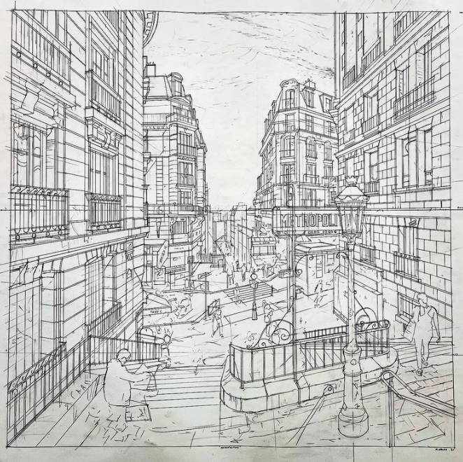 在内森·沃尔什看来,城市为绘画提供了无限可能,他喜欢在城市中间穿梭闲逛,遇到感兴趣的场景,他就会拍摄下照片,回到工作室后,他就会在画布上进行构图,去画草图和线稿。即便只是看了他的线稿,也能让人彻底服气,因为他的空间透视关系,画得太绝了。