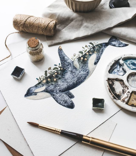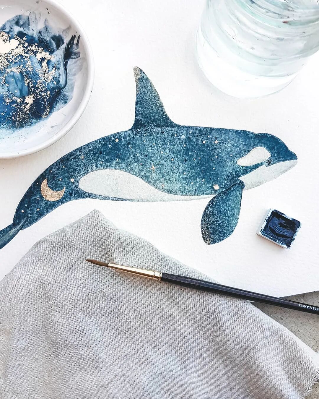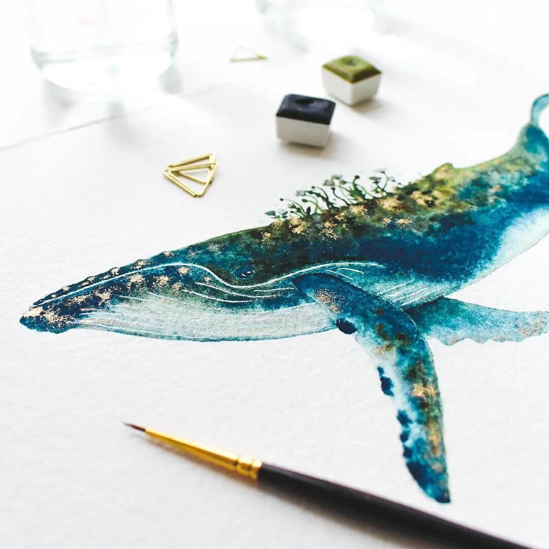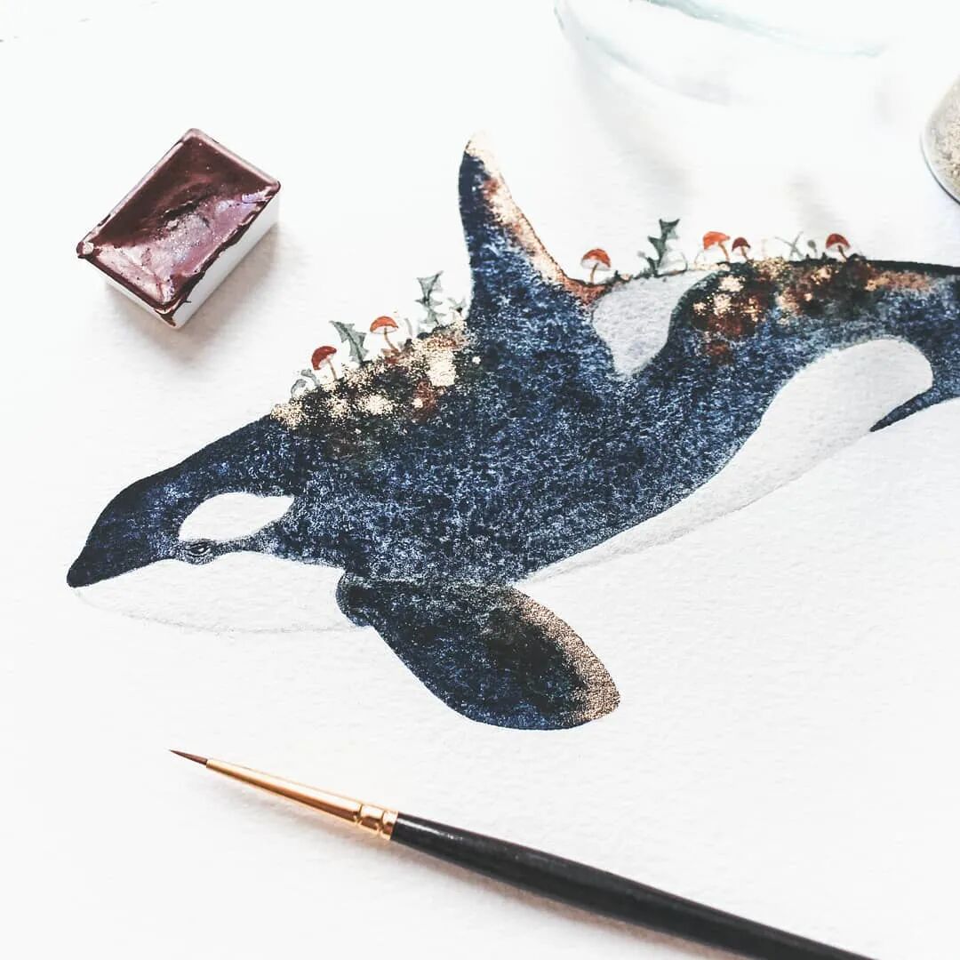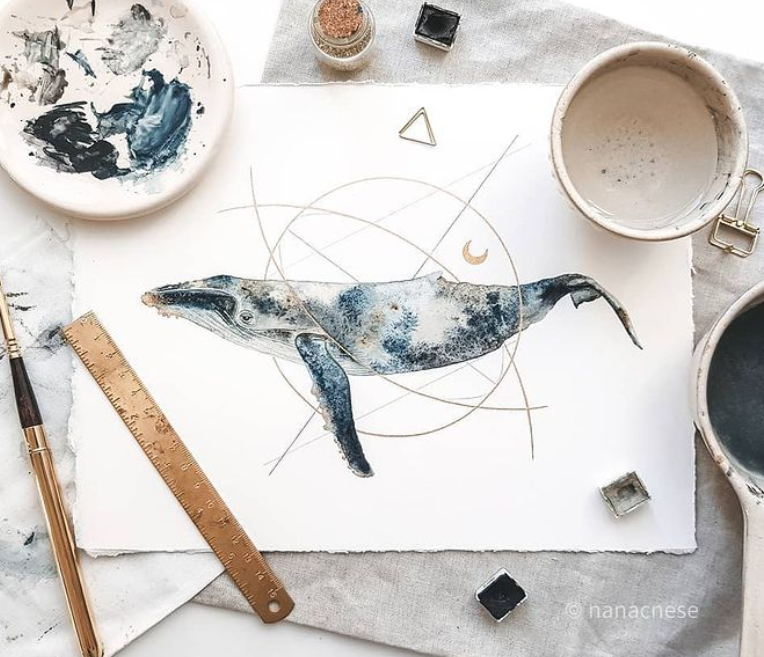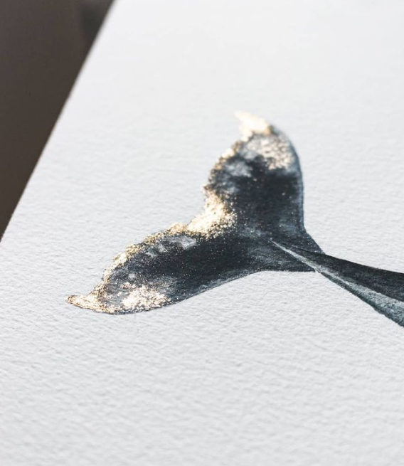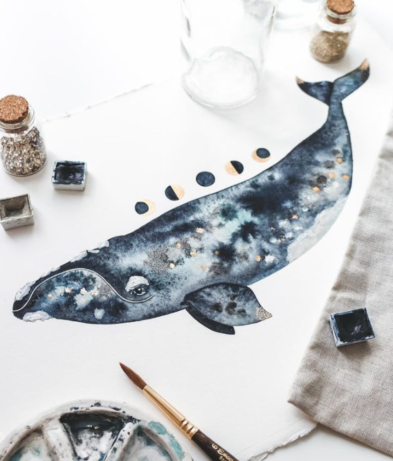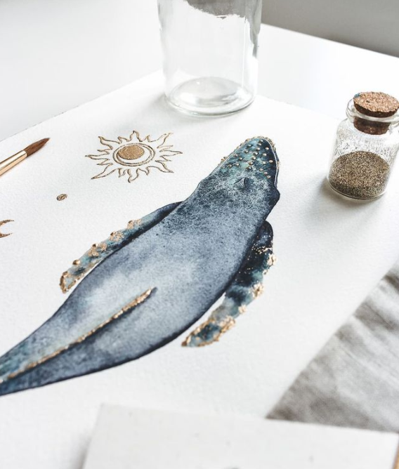 迦南·埃森还在自己的作品中加入了金箔,一点点的金箔,让她的画作完成了升华,为她的主题增加了更多的梦幻感和空灵感,画中的鲸鱼仿佛全身闪耀着光芒,优雅的动作也变得更加迷人了。