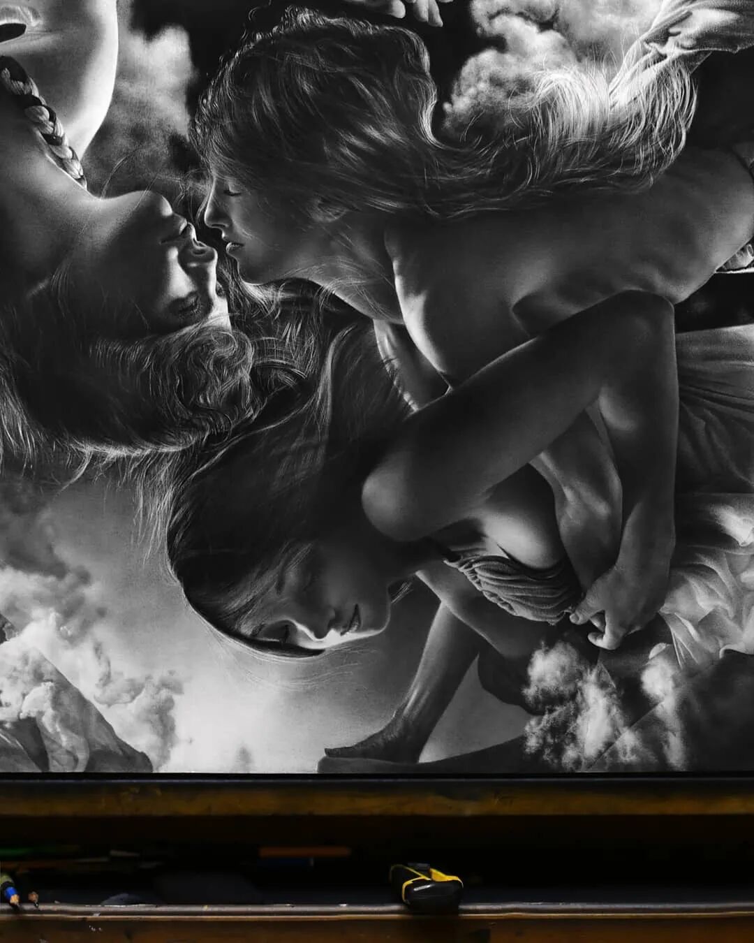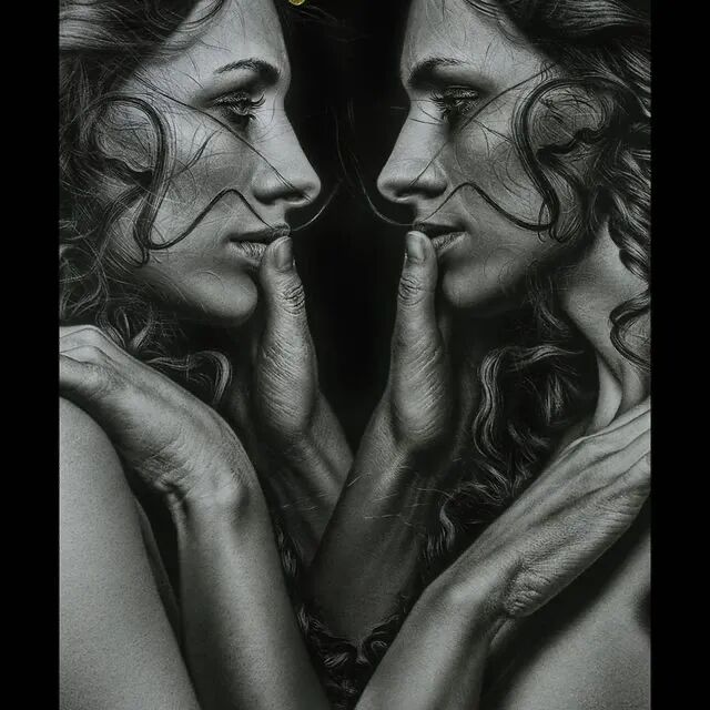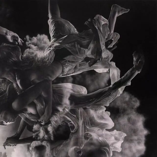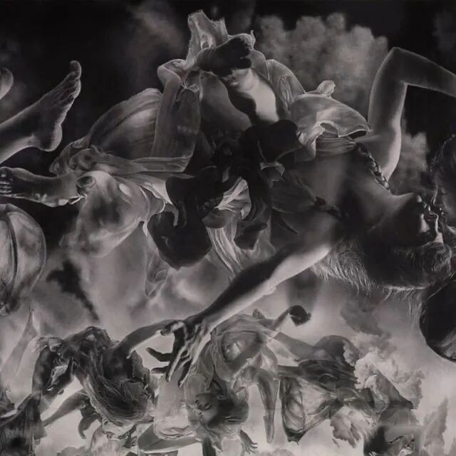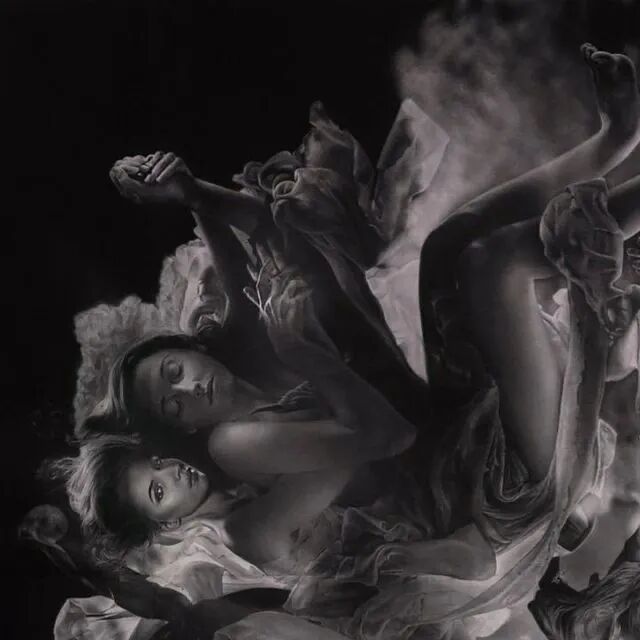 这幅超现实主义素描作品以铅笔和木炭组合创作,漆黑的背景下,每一个人物都有着难以置信的细节,散落的头发、人物面部的皱纹、神态,以及身姿,都被刻画得淋漓尽致。虽然是一幅当代作品,但是却带给人一种经典绘画的感觉,颇有16世纪著名画家卡拉瓦乔作品的味道。