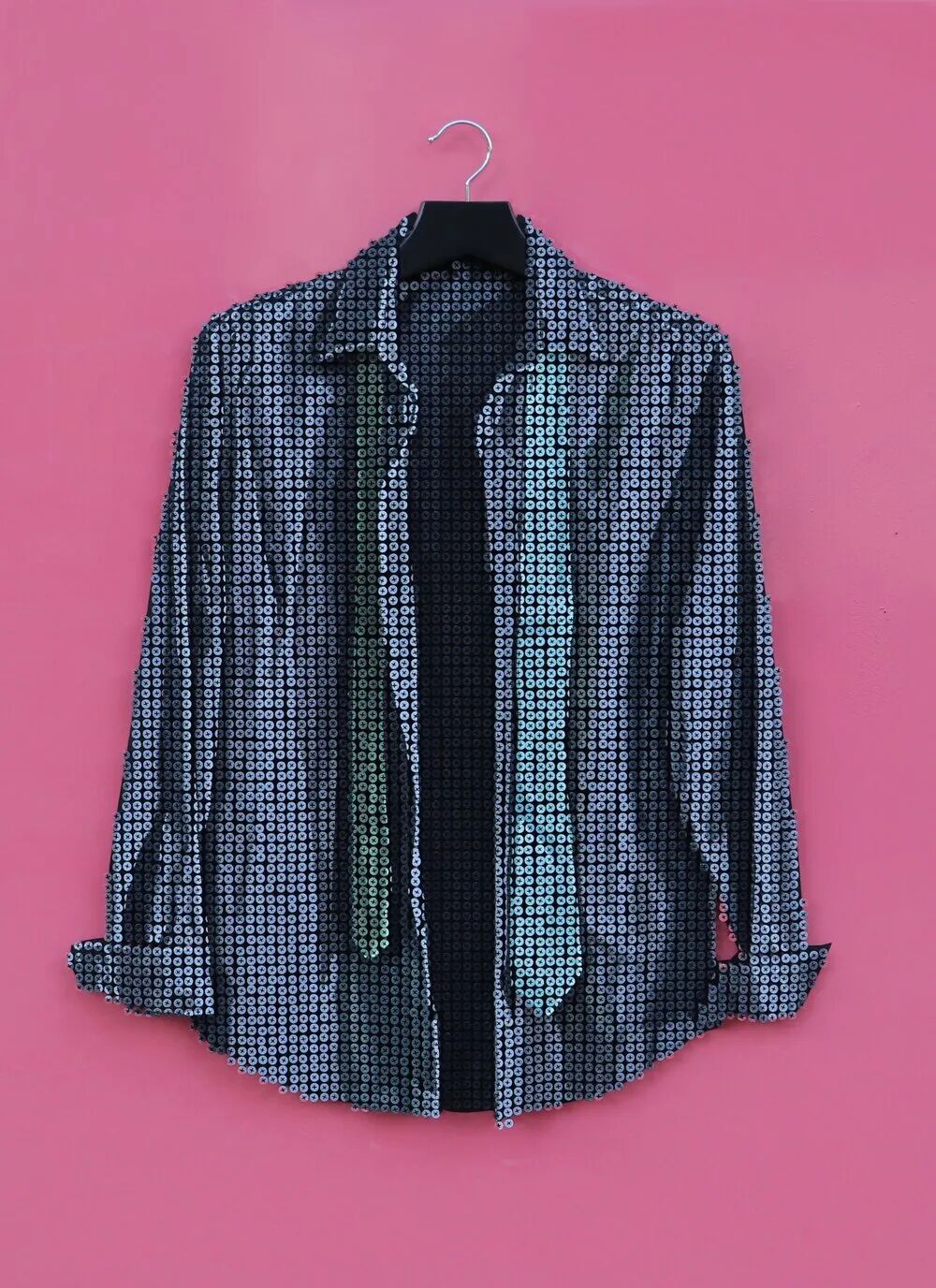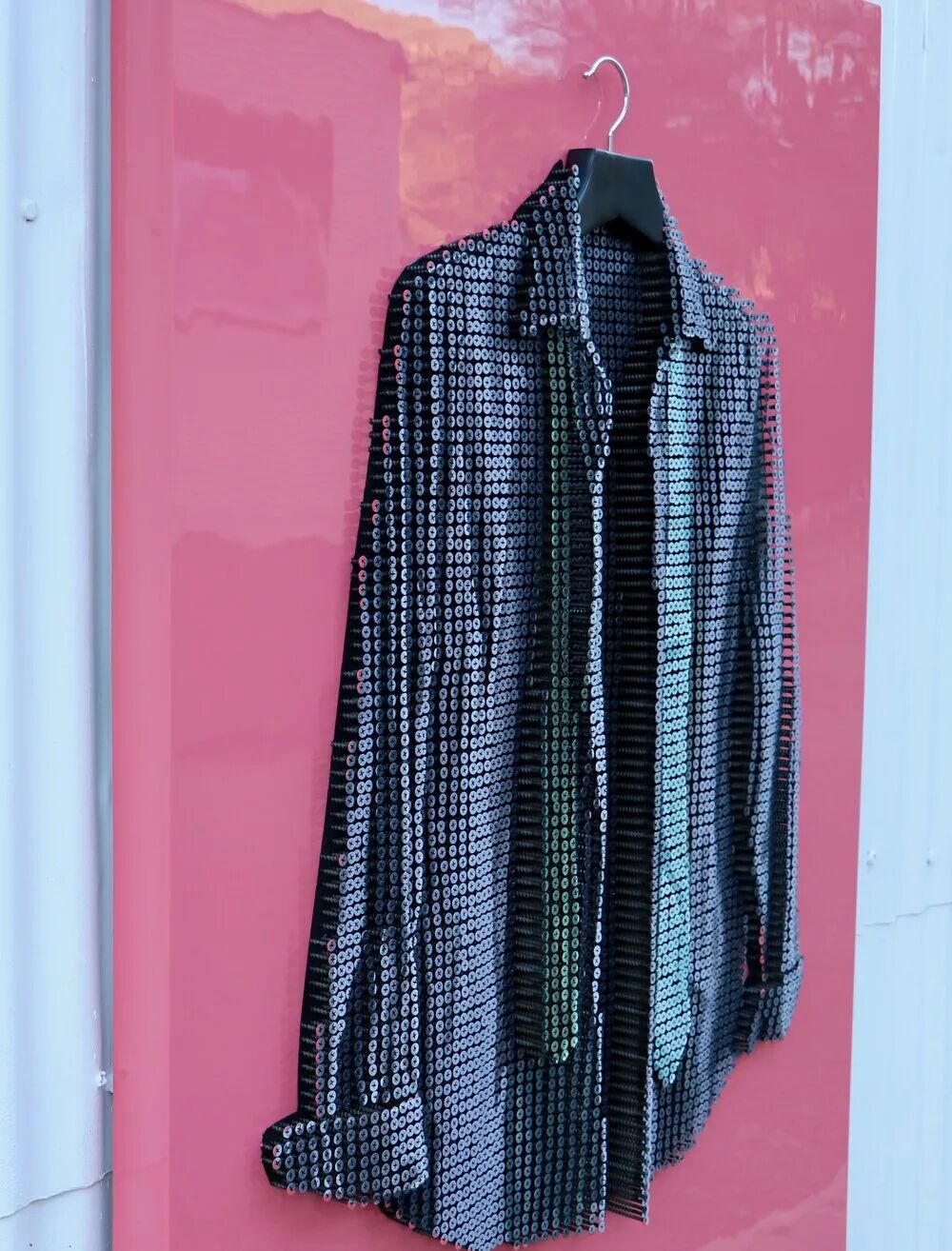 一个带领带的衬衫作品,就使用了超过5500根螺丝钉,按8.5克一根铁钉来计算,1000根钉子就是8.5公斤,5500根钉子的重量将近90斤重,再加上画框和其他材料,一个成年男子搬起来都费劲。