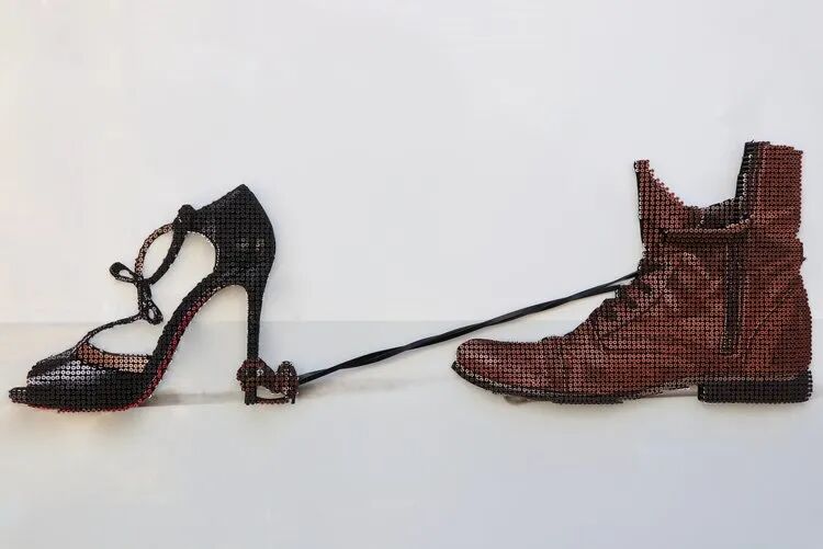 虽然使用的材料很硬,毕竟是金属螺丝钉,但是意外的是,安德鲁·迈尔斯的作品中,还有令人惊讶的柔软感,一双带有褶皱的靴子,让人直观地感受到,靴子的皮面是柔软的材质,正是有着精细的细节,才让他的作品呈现出刚与柔的和谐。