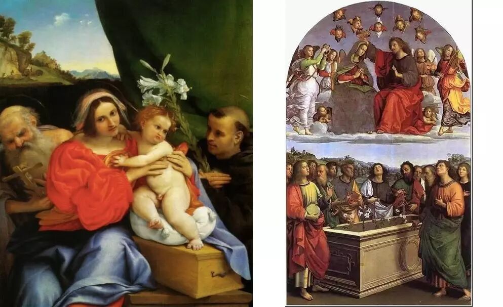 右图《圣母加冕》是文艺复兴三杰之一拉斐尔的作品,拉斐尔以画圣母画著名,他笔下的圣母被称为最完美的圣母形象,在这幅《圣母加冕》中,最吸引人注意的就是棺材中白色的百合花。