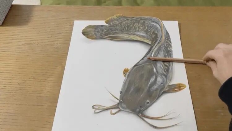 这些绘画插图常常让人误以为是真实的实物,实际上它们都是二维的,通过仔细地勾勒出物体的草图,然后用彩色铅笔层层填充,使得画面呈现出立体感。艾莉亚最近在纸上画了一条鲶鱼,看起来就好像要从纸上游出来,让人直呼不可思议。