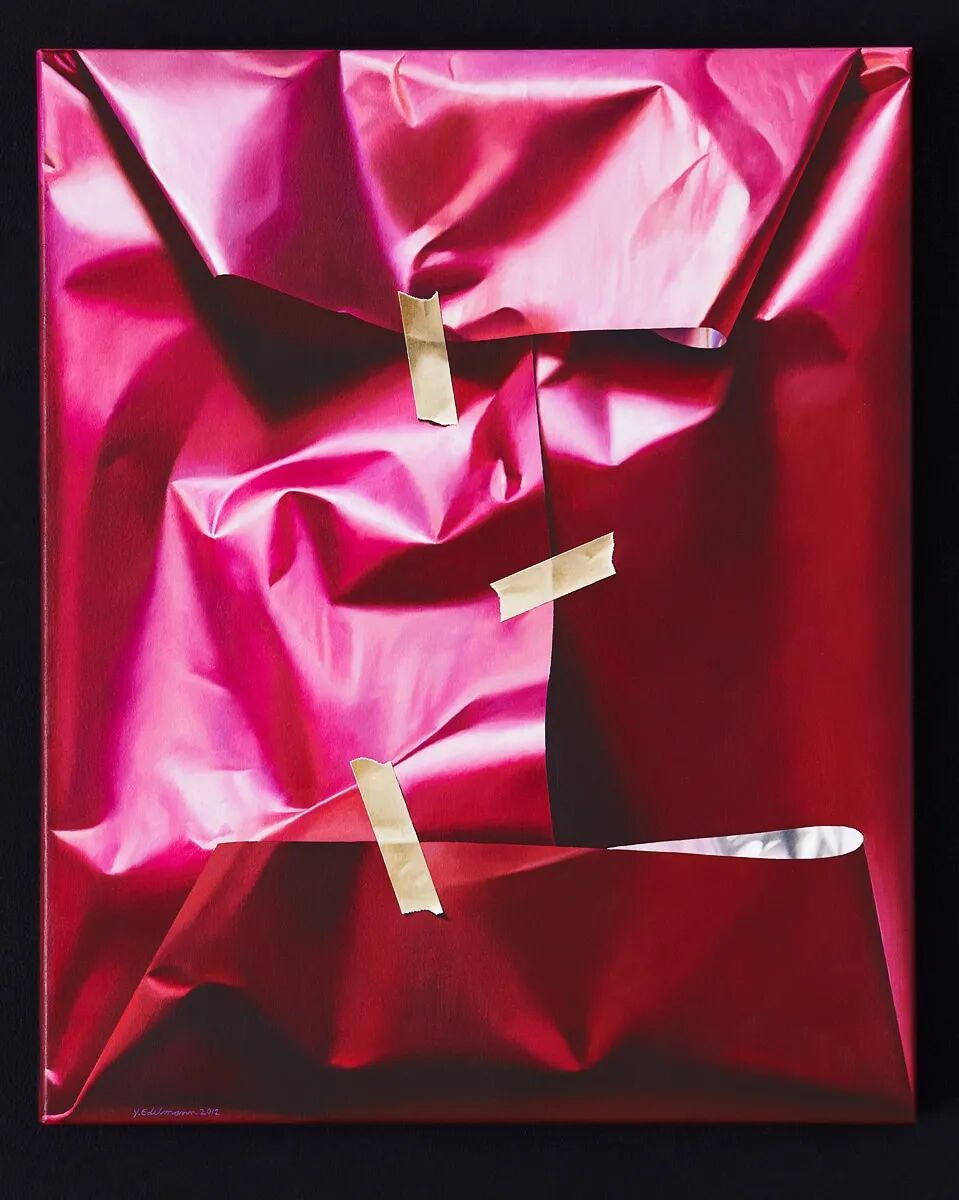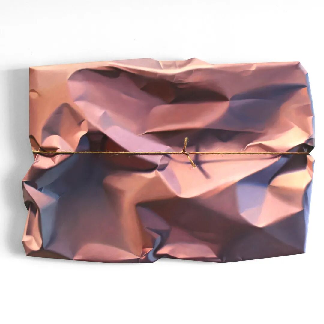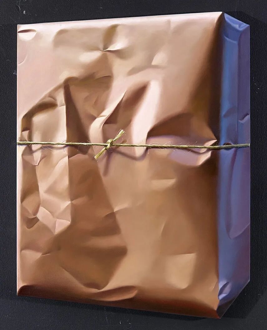 伊尔·杰德曼描绘的,是各种颜色的彩色包装纸,这些包装纸有着超级真实的褶皱和纹理,有的时候在包裹完之后,还会有一根绳子系在上面,或者几条胶带粘在上面,这让伊尔·杰德曼的写实绘画更加真实,如果不刻意提醒,很难将它们与绘画联系在一起。