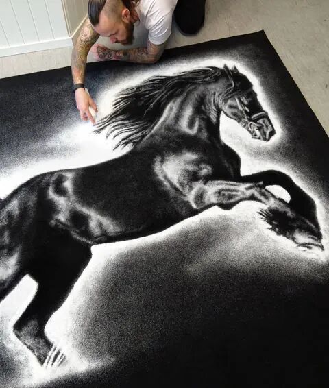 艺术家将盐装进塑料瓶中,就制成了一个简易版的画笔,跟其他的画作不同,用盐画画只能在地面上进行。迪诺·托米奇双手和膝盖着地,在一张巨大的黑纸上,喷洒出画作的轮廓,并一点点完善细节,最终呈现出一张细节丰富,形象逼真的作品,之所以选择塑料瓶,是因为塑料瓶可以用手随意捏扁,以便于控制盐的用量。