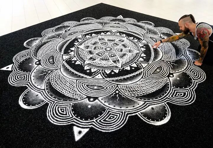因为,艺术家迪诺·托米奇不仅在黑色的纸板上画画,并且使用的绘画材料,并不是画笔、颜料等,而是一把把白色的盐巴,你没有想错,就是我们平时炒菜做饭使用的盐巴。
