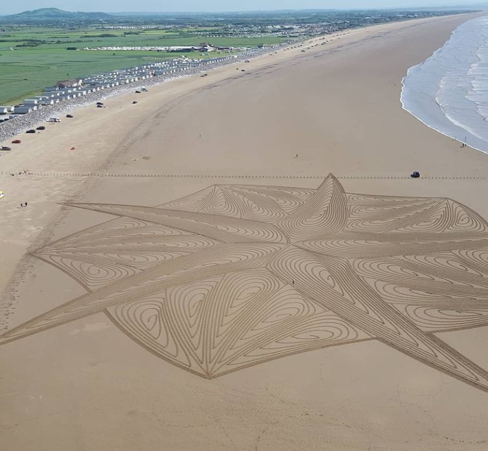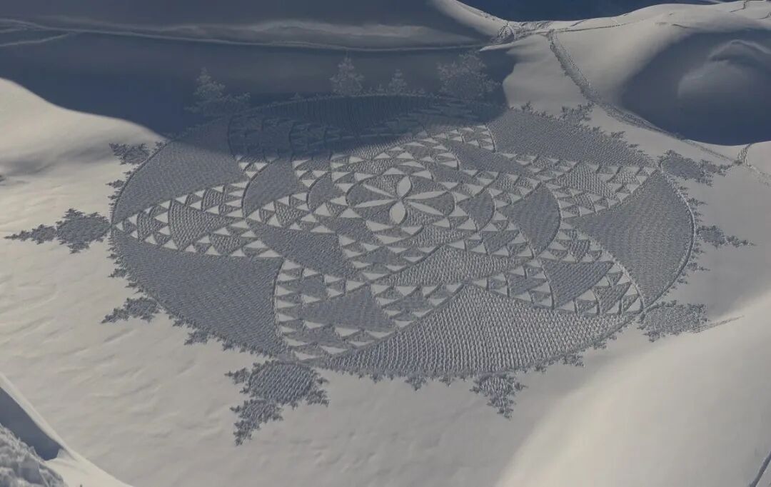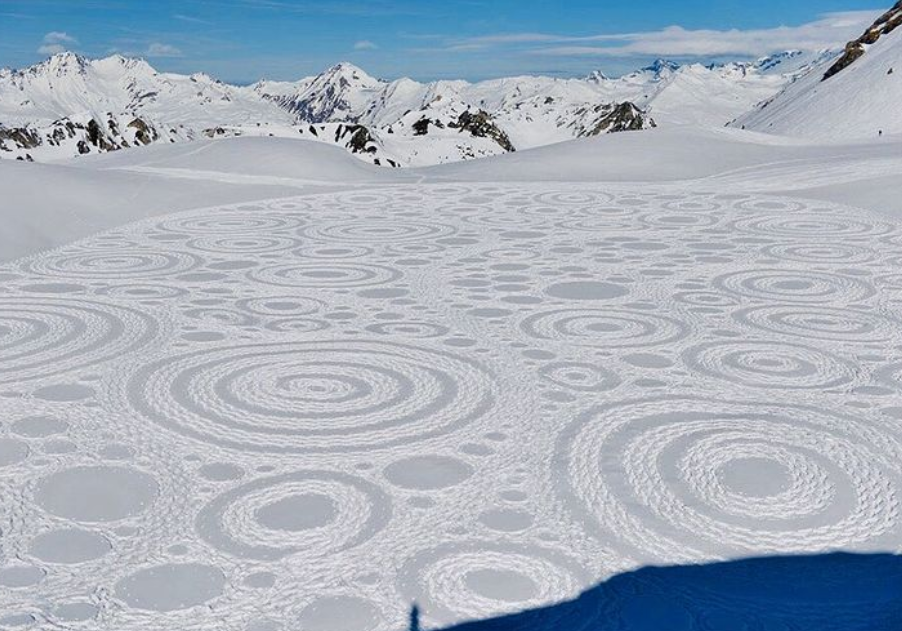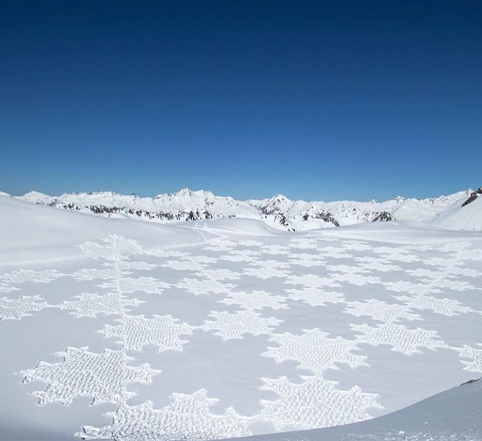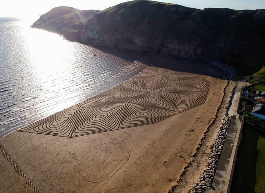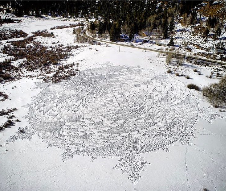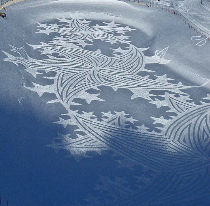 今天小绛还是要跟大家介绍一名土地艺术家,他就是依靠自然气候开辟了自己艺术道路的西蒙·贝克,天天踏浪,冬天踩雪,十多年的时间里,他在足球大小的场地上,通过用双脚行走,创造出众多引人注目的大型几何图案,通常一幅画作的尺寸在2000平米左右,更大的也有,几乎能铺满整个足球场。