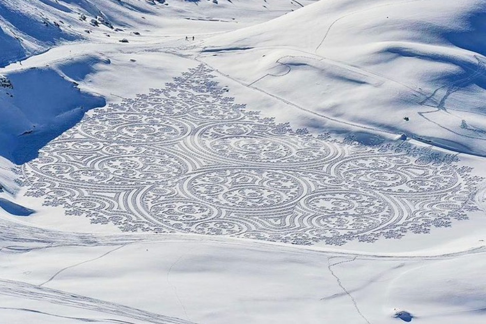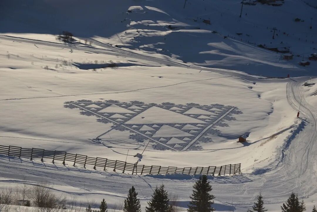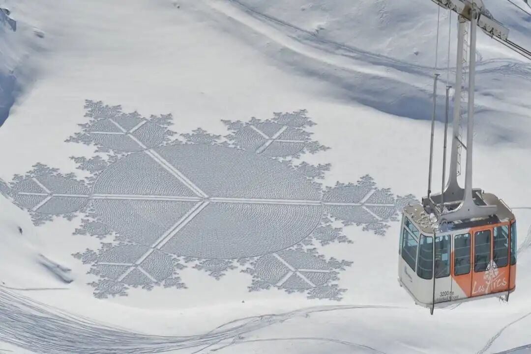 这是一个漫长的任务,通常,西蒙·贝克一天的工作是在沙滩或雪地里跋涉12个小时,兜里会装一点零食,饿了就在原地歇歇脚,拿出来吃一点,然后继续行走。他的脚步丈量了荒凉的山景和白雪皑皑的城市体育馆,努力的结果令人敬佩,创作的土地艺术有着难以置信的震撼。
