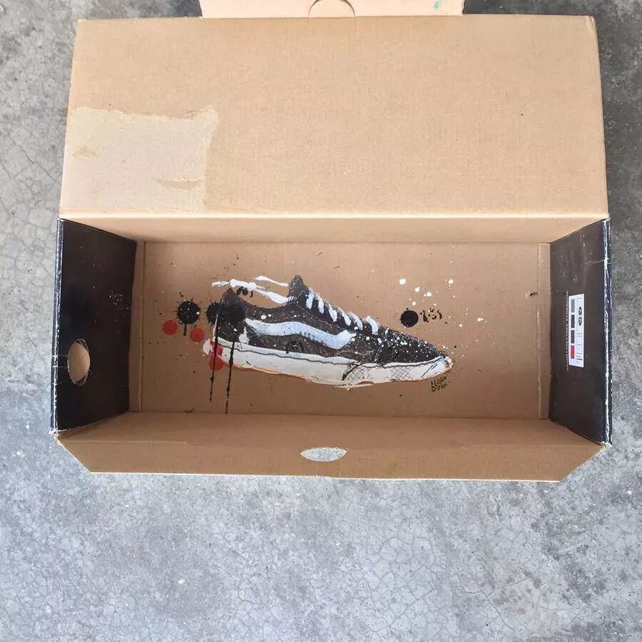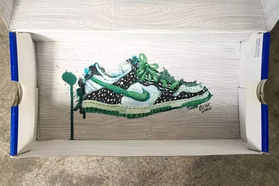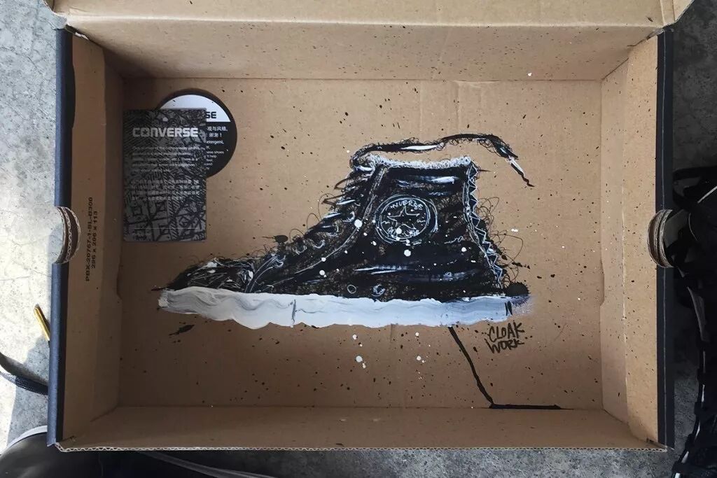 艺术家克罗克·沃克的鞋盒艺术涂鸦就是其中的一种,他将自己的每一款鞋子,都原模原样地绘制在了鞋盒的底部,于是一个个无用又占地的鞋盒焕发了新鲜的活力,成了一个个独一无二的艺术品,看上去要比鞋子本身更有价值。