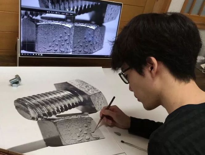 今年才刚满25岁的日本画家大森浩平,凭借一幅螺丝素描引起轰动,这幅素描作品在质感上非常接近钢铁,当然,这样逼真的质感花费了他几百个小时的时间。