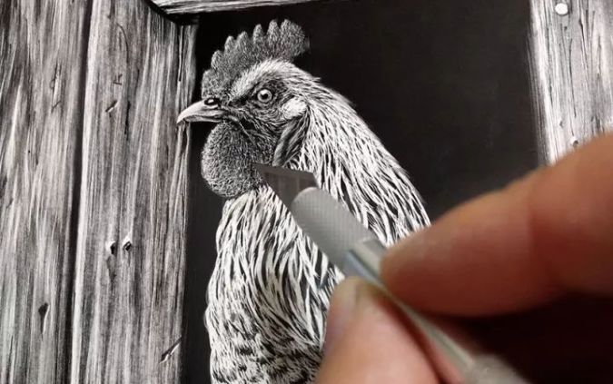 凯西说,首先需要准备一张特制的刮板,然后再在刮板上涂上黑色的油墨。接着用刮刀在刮板上进行刻画,这样就会露出黑色油墨下面的白色,只要进行反复刻画,一幅超写实作品就创作出来了。