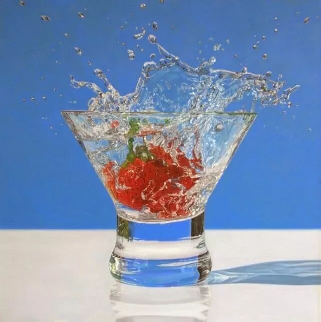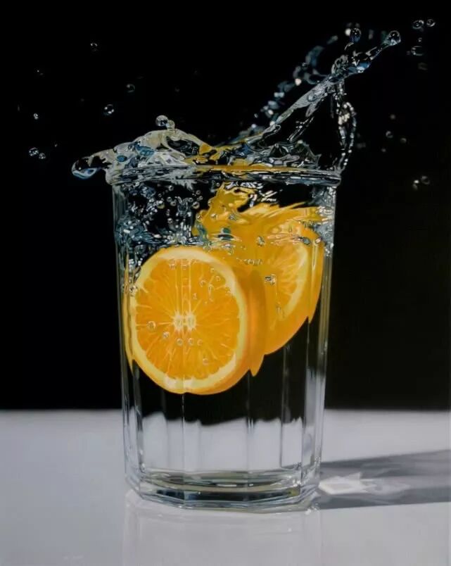 他的绘画之所以看起来如此真实,是因为他喜欢在创作中融入一些创意,而不是简单的复制还原,他将两片橙子扔玻璃水杯里的瞬间,用画笔表现出来,水在杯子里往上跃起,上扬,飞溅,极具灵动感。