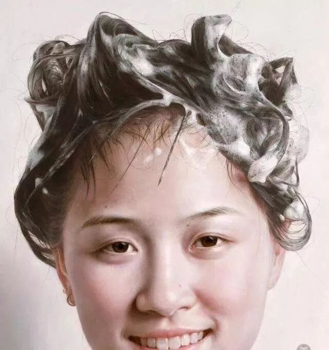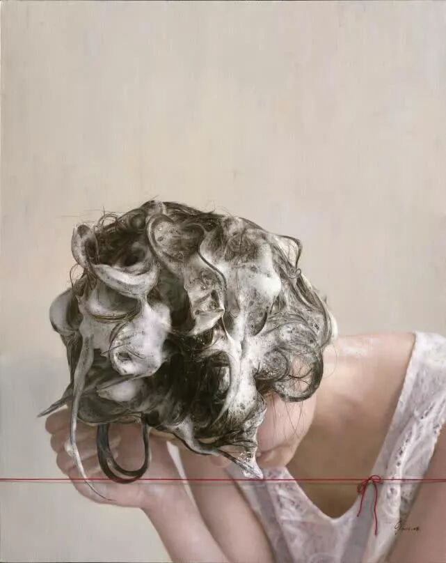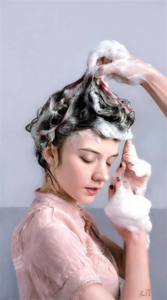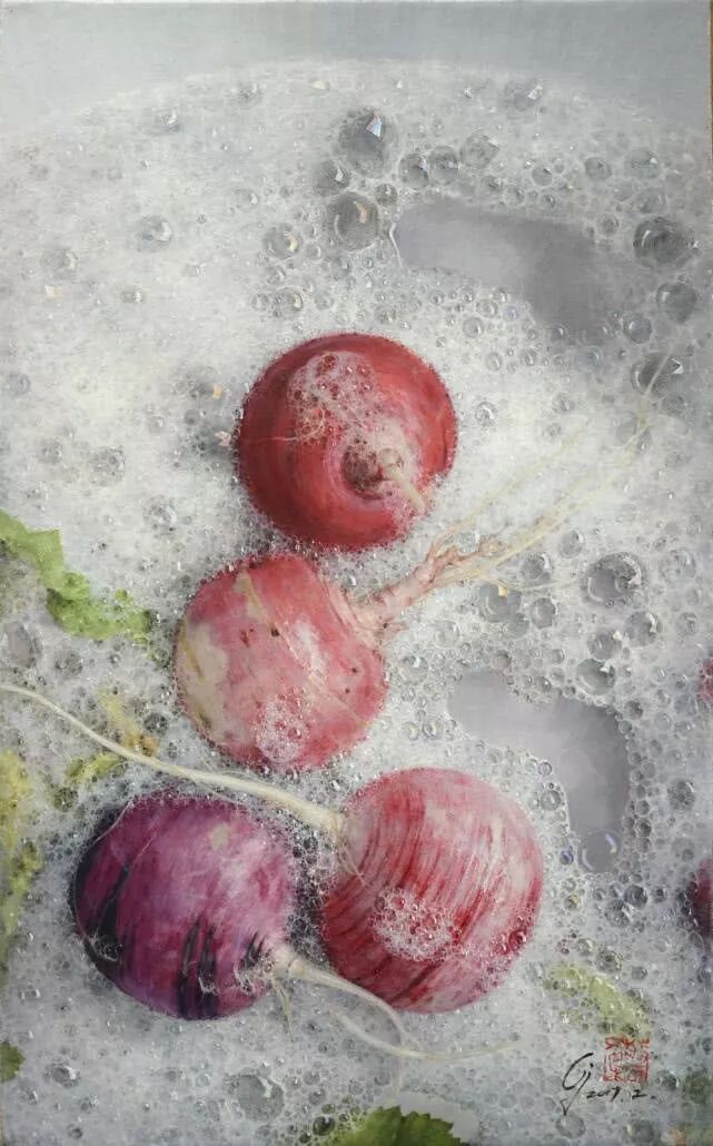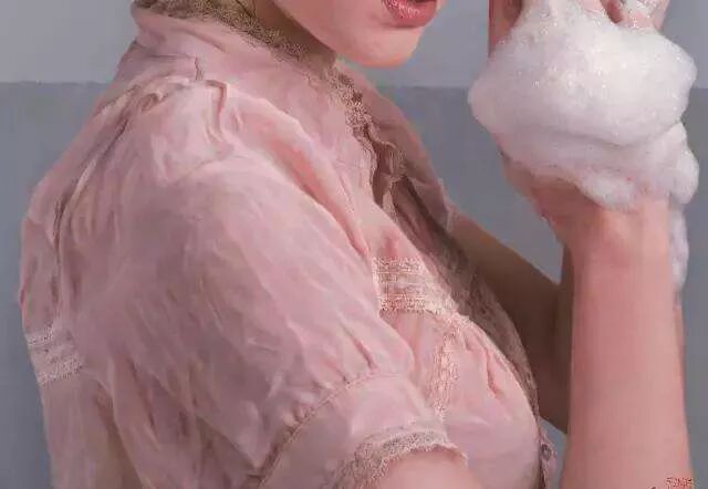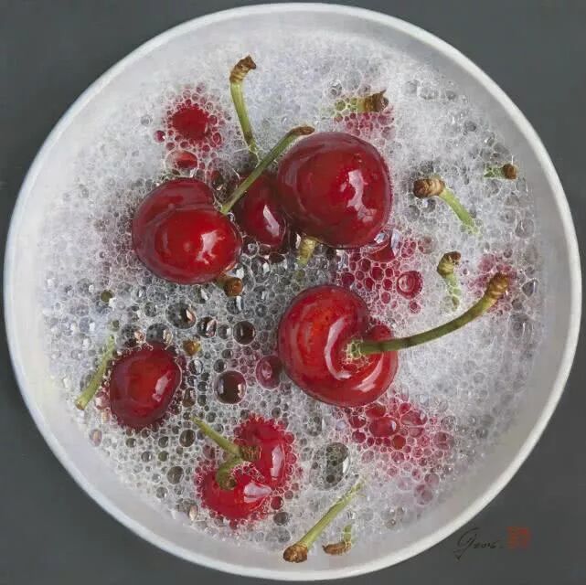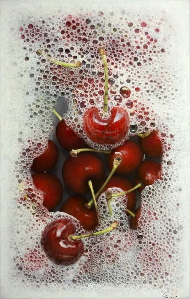 蔡杰于1973年出生于浙江,除了写实樱桃,他还极其擅长画泡泡,比如泡在碗里的樱桃,水面上会漂浮着数不清的大大小小的泡泡,还有顶着一头泡沫的,正在洗头发的女子。