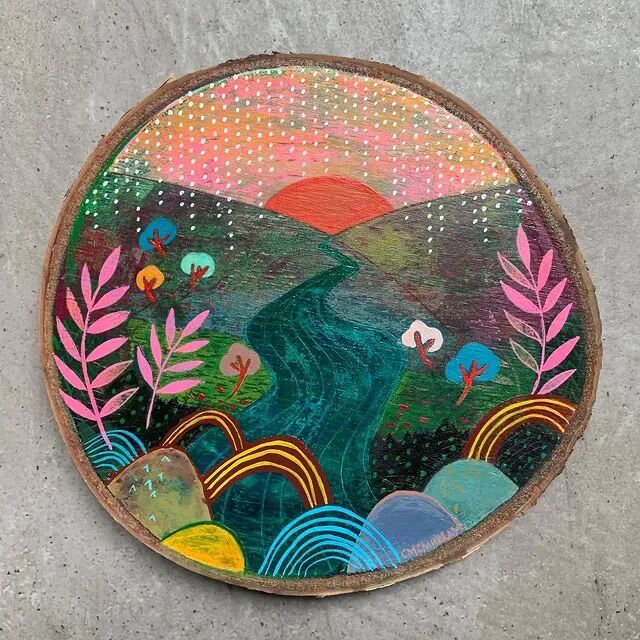 凯西·麦克默里还是一位环保主义者,她用来创作艺术品的很多材料,都是通过回收得来的,她小心翼翼地尊重自然环境,回馈给大自然精美的艺术品。凯西·麦克默里画在木板上的画,色彩非常丰富,饱和度非常高,多种颜色混合在一起,却不会给人非常杂乱的感觉,反而非常质朴,让人看了心生欢喜。