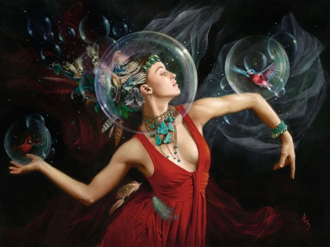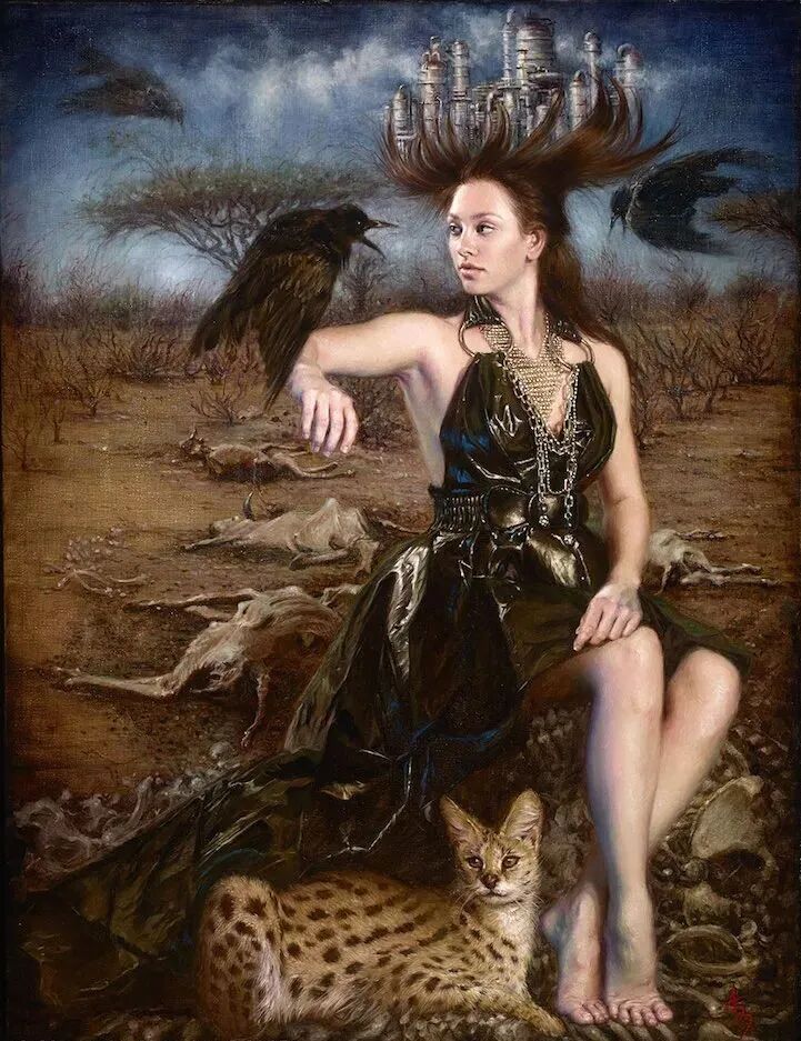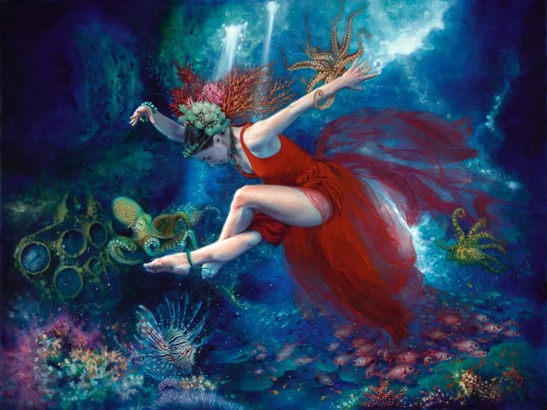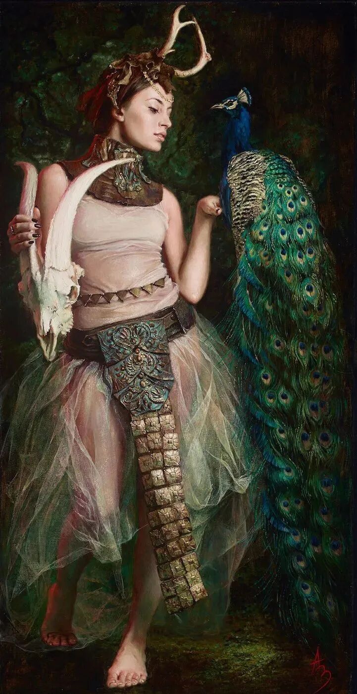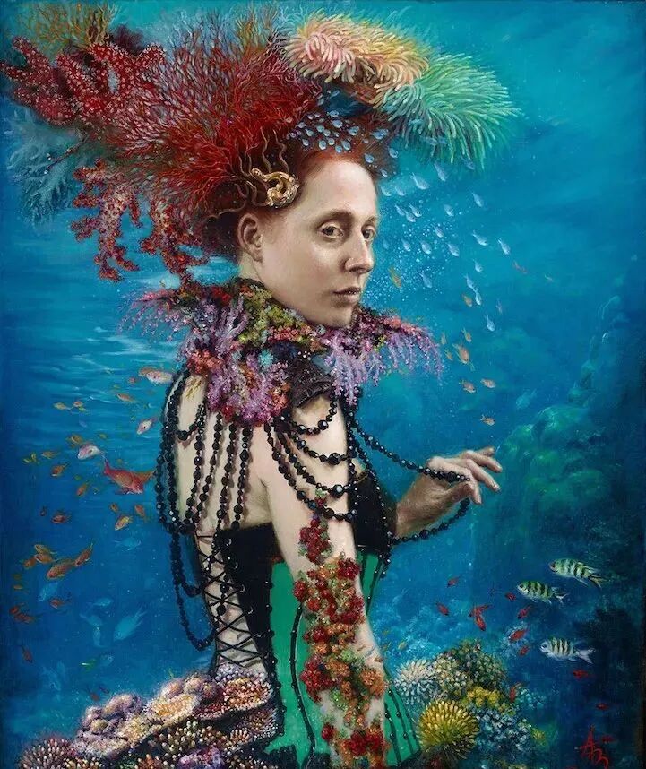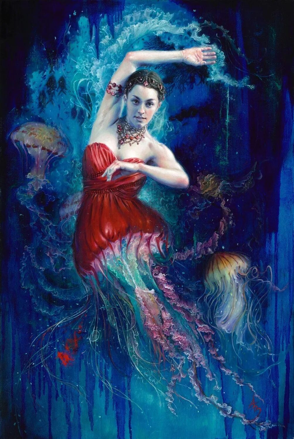 这位艺术家以这种独特的方式,描绘了女性的坚强和美丽,优雅和力量的平衡。同时,画面中出现的大量野生动物、海洋生物,也传递出了亚历山德拉·马努克岩对自然和生态的关注。她以丰富、深刻、神秘的画作,鼓励观众去探索和发现更多的现实意义和深度。