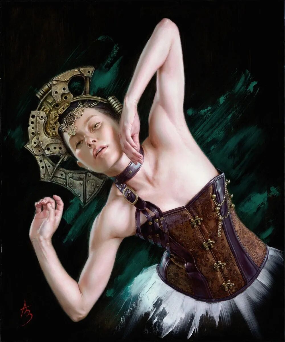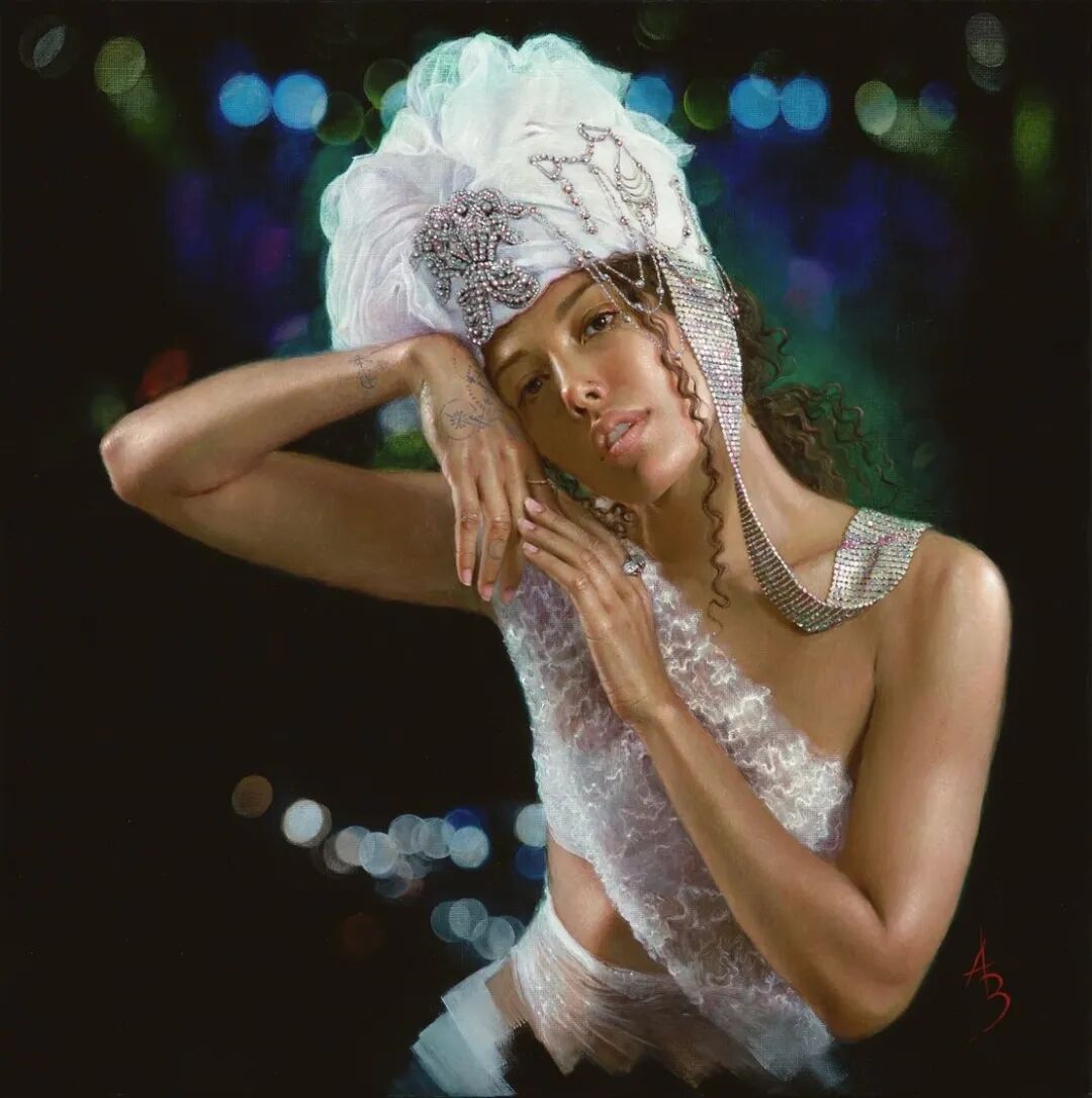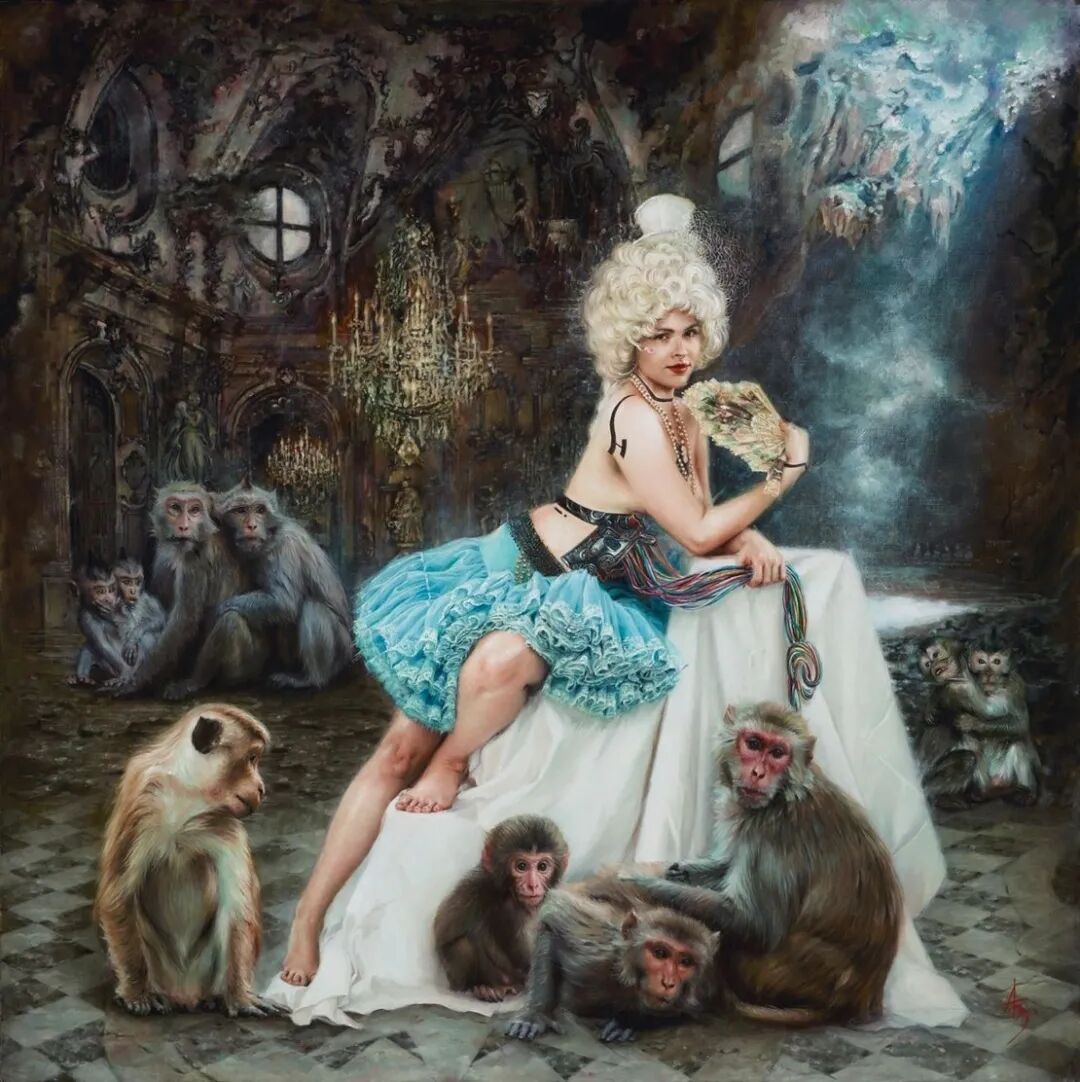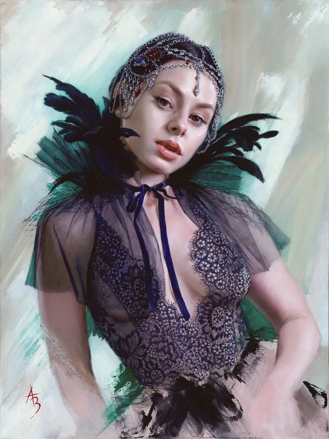 来自美国加州的艺术家亚历山德拉·马努克岩就以暗黑系的超写实主义油画知名,她的创作主题大多是年轻的女性角色,将厚重与柔软,坚强与流动进行了有机结合,创作出了一种强烈的对比,颇具戏剧性。她的画作中就融入了大量中国画的元素,花鸟写意几乎在她的每一幅作品中都有体现。