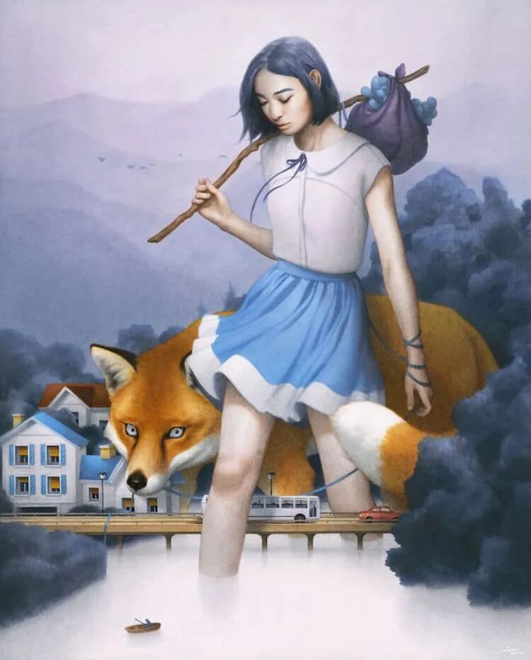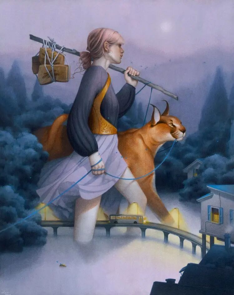 像许多年轻人一样,陈阮也是看着动漫和卡通动画长大,这些作品埋下了她对艺术创作的种子,在她最新创作的作品中我们可以看到变成巨人的女性角色,她们的体型超越了房子,甚至比灯塔还要高上很多,除了变大的女性角色外,在她们身边的动物朋友,也都变成了巨型生物,在一片朦胧和静谧的环境中思考和行走,仿佛寓意着什么。