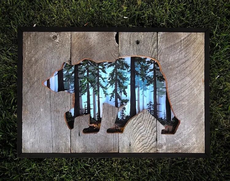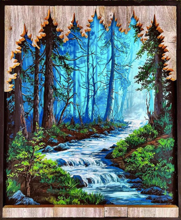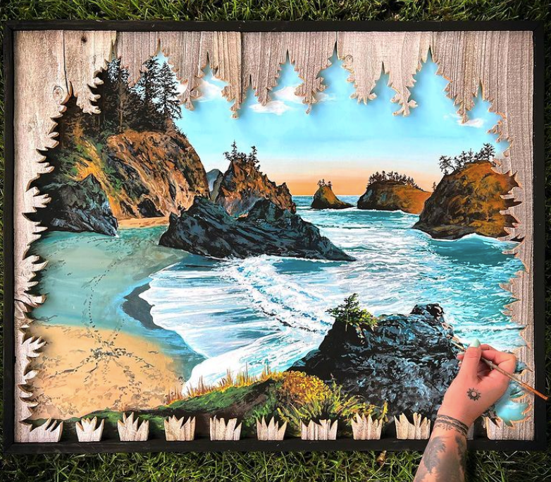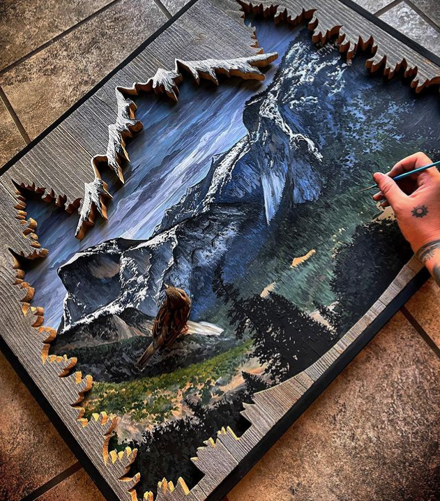 接下来小绛要分享给大家的这位艺术家,创作作品的方式也非常“秀”,她就是来自波斯尼亚的美女艺术家蒙哥马利,她将木雕与绘画相结合,创作出了真正的3D风景画,视觉效果一级棒。