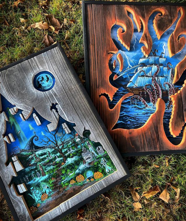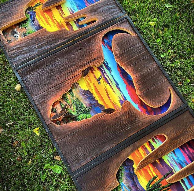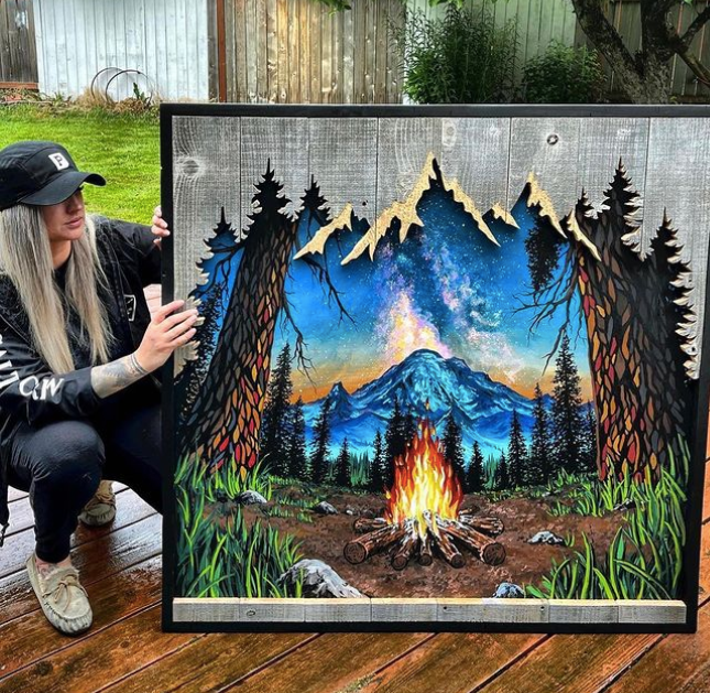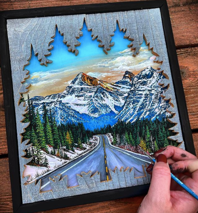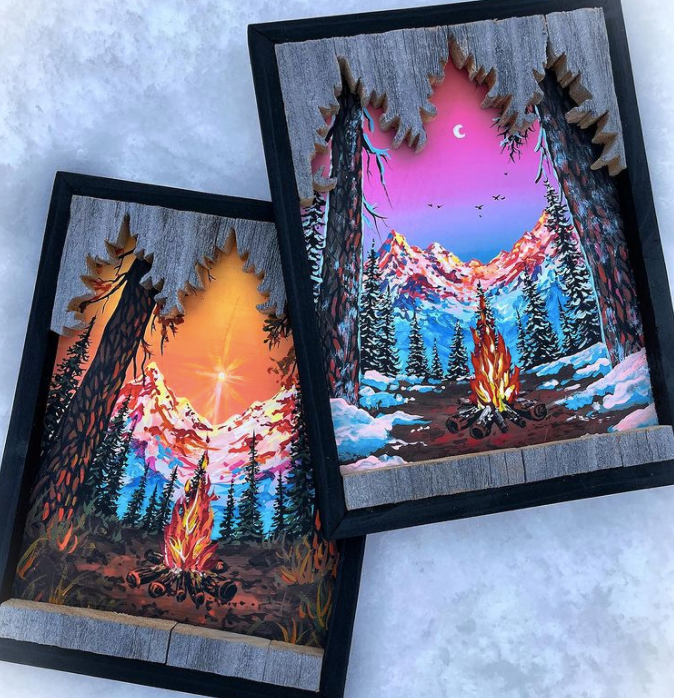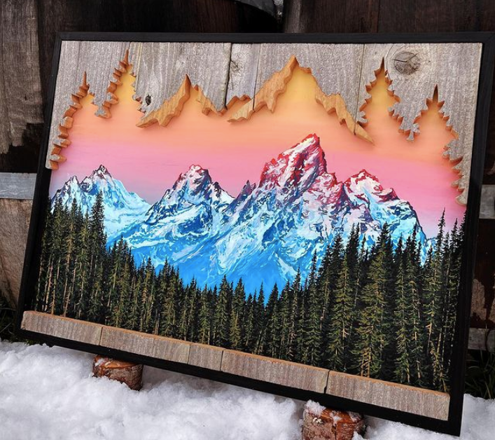 这些引人注目的木制艺术作品,创作灵感来自野生自然乡村场景,每一件作品都展现了蒙哥马利对绘画和户外景观的热爱。作品中雄伟的山脉、参天的树木、繁星点点的天空以及波光粼粼的水面......令人惊叹的自然景观,让人直呼爱了爱了。