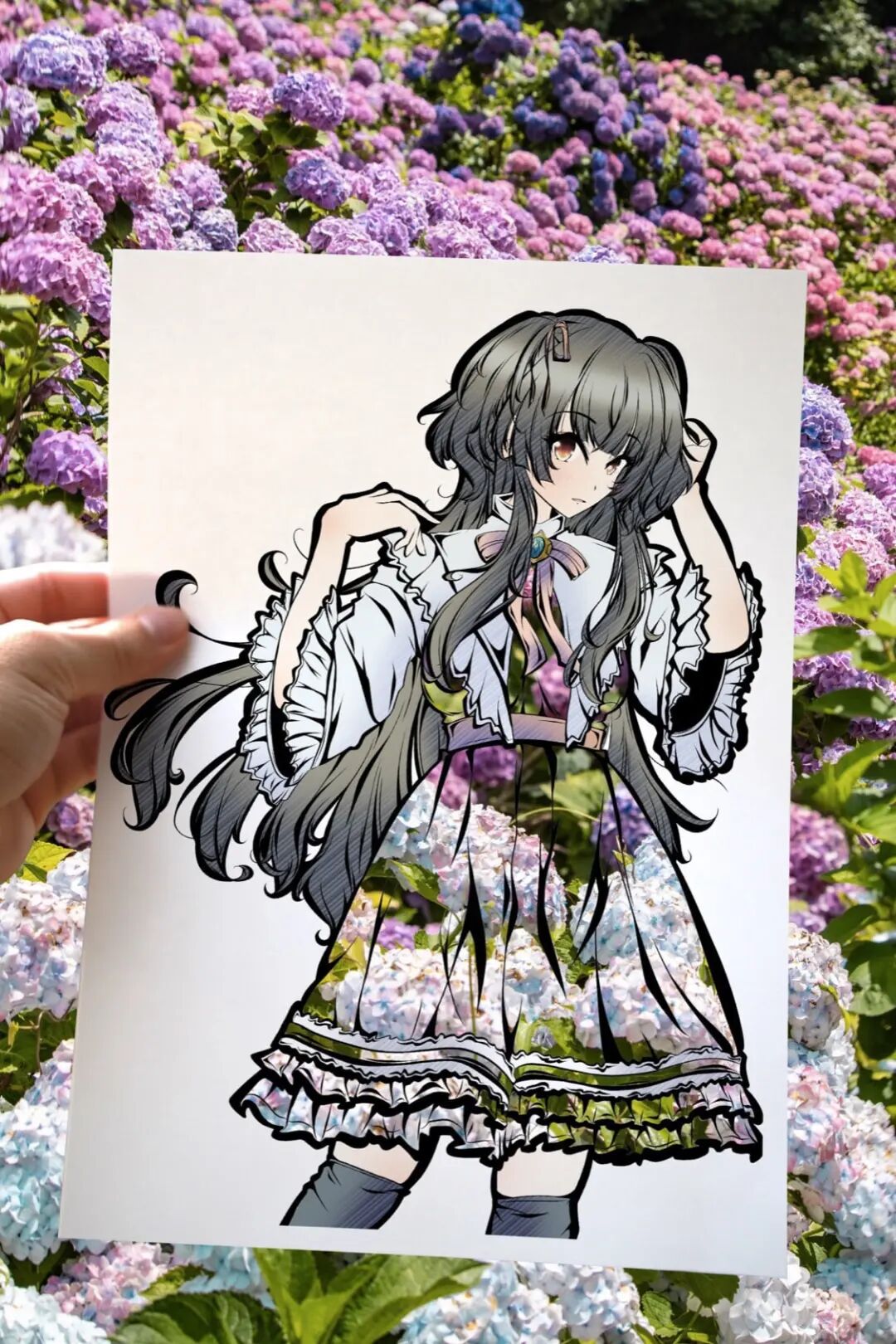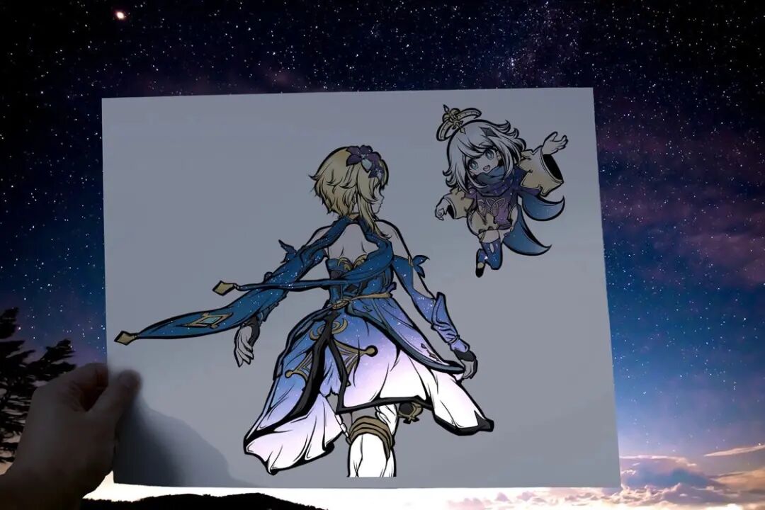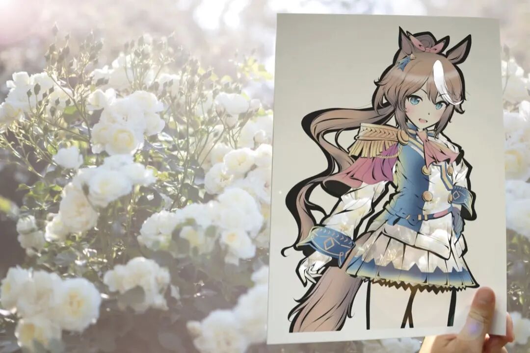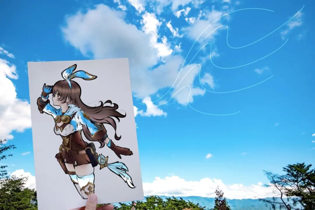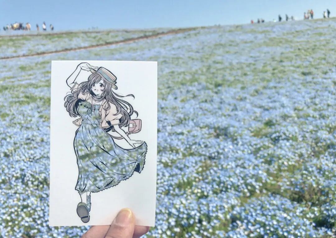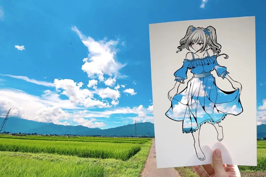 首先,虎彻首先会在一张白纸上勾勒出一个穿着衣服的女孩的插图,每幅插图都有浓密的黑色轮廓,角色的某些部分以柔和色调着色。接着,他会将画面中服装的部分进行镂空处理,以剪纸的形式剪掉和服的部分,只留下衣服的褶皱和轮廓,最后一步才是“注入灵魂”的关键,艺术家将镂空插画拿到户外,手持置于自然背景前。于是,树木、树叶和五彩缤纷的天空成为了和服女孩衣服的图案和色调,美丽极了,并且,每一件作品都是独一无二不可复制的。