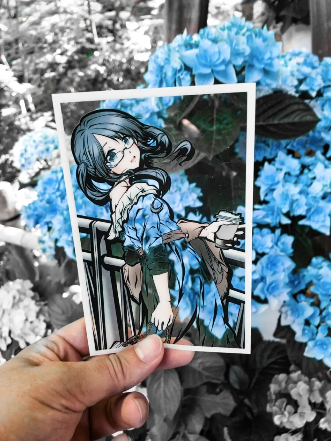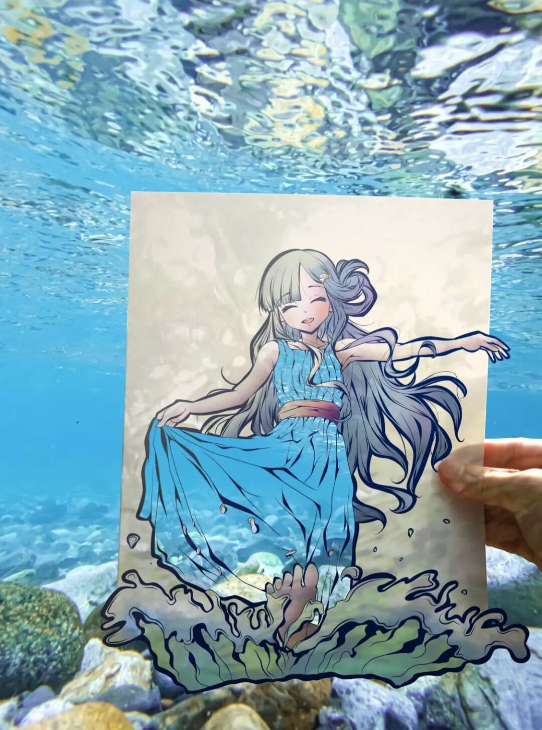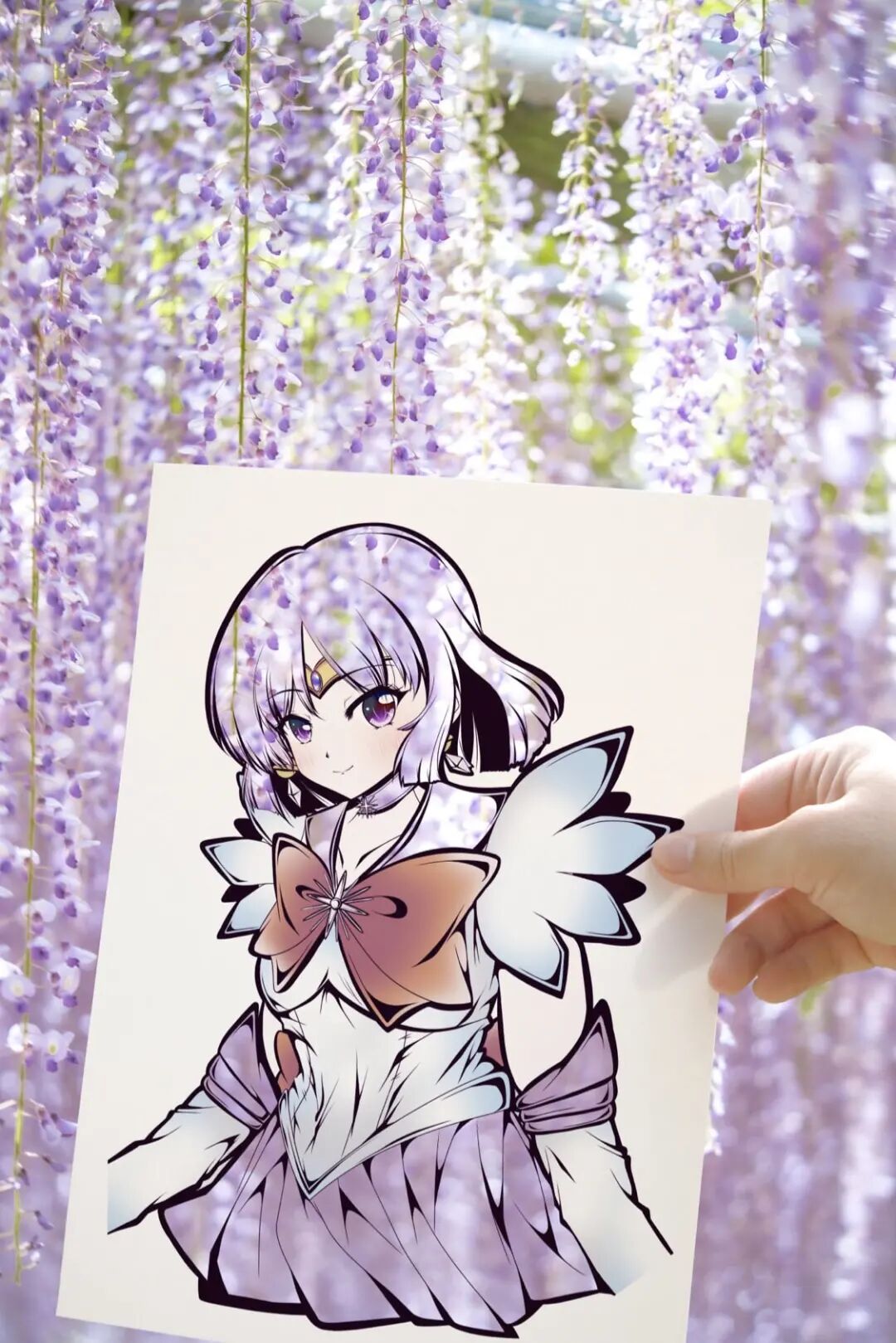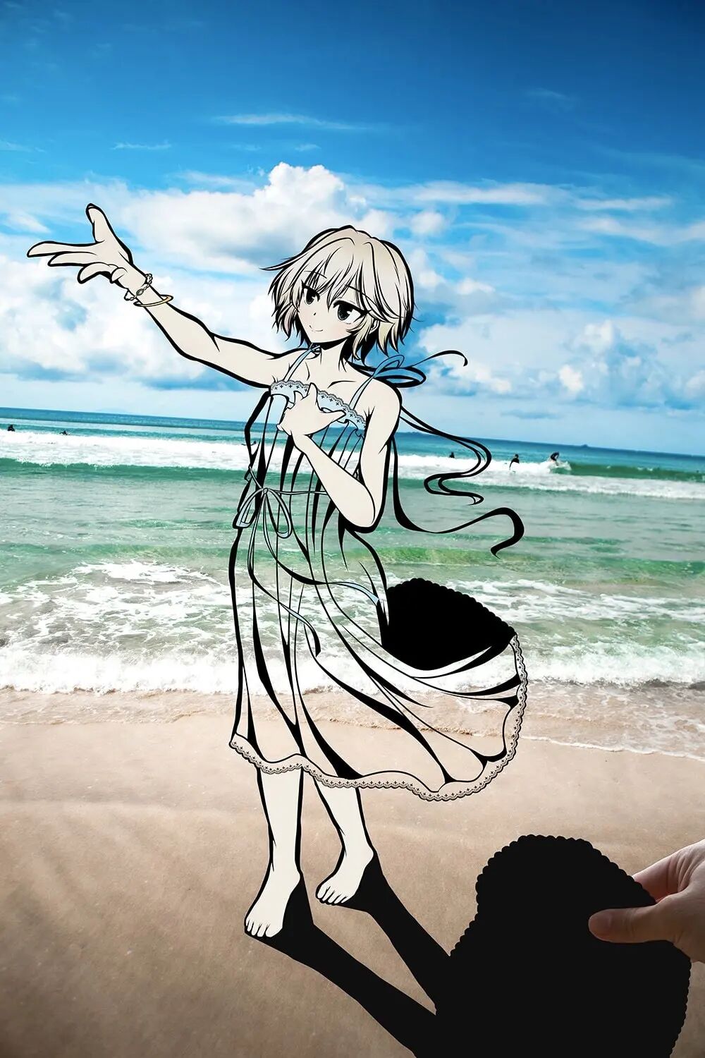 首先,虎彻首先会在一张白纸上勾勒出一个穿着衣服的女孩的插图,每幅插图都有浓密的黑色轮廓,角色的某些部分以柔和色调着色。接着,他会将画面中服装的部分进行镂空处理,以剪纸的形式剪掉和服的部分,只留下衣服的褶皱和轮廓,最后一步才是“注入灵魂”的关键,艺术家将镂空插画拿到户外,手持置于自然背景前。于是,树木、树叶和五彩缤纷的天空成为了和服女孩衣服的图案和色调,美丽极了,并且,每一件作品都是独一无二不可复制的。