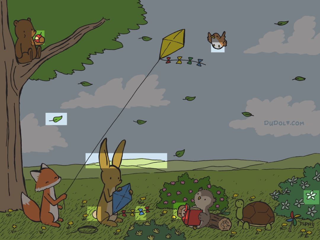杜多夫的找茬插画,主要分为两种类型,第一种找茬图是在一幅同样事物的插画中,隐藏起来一个类似的事物,让人们去寻找它,例如:在雪人中藏一只熊猫;在花朵中藏一只蝴蝶;在鸟群中藏一只公鸡等等。而另一种找茬图片则是我们“传统意义”上的找茬游戏,这种找茬图片一般由两幅图片组成,需要人们对比这两幅图片,从中找出不一致的地方。