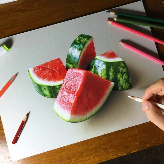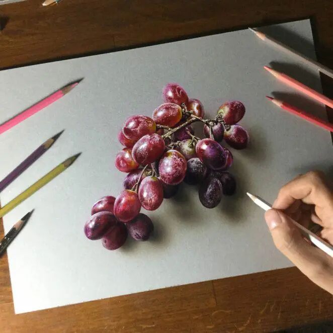 马塞洛·巴伦吉所使用的的绘画工具只有不同颜色的彩铅,通过营造出极强的光影,来塑造立体感,质感也表现得非常到位,西瓜看起来很好吃,葡萄也是很新鲜的样子。除了被认可之外,马塞洛·巴伦吉还受到了一些质疑,很多人怀疑他的画作不是画出来的,而是借助了修图软件或者是实物摆拍。