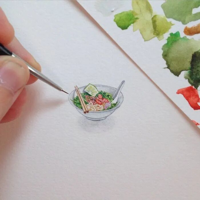 大约有一年的时间,布鲁克·罗斯尚克持续不断地更新自己的画作,从可爱的小动物,到美味的食物,布鲁克·罗斯尚克画的微缩画作,非常贴近我们的生活,每一幅都能带给人愉悦的心情。