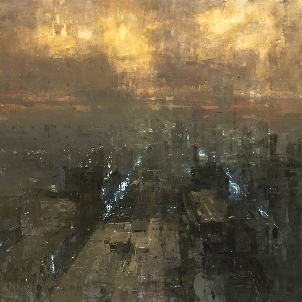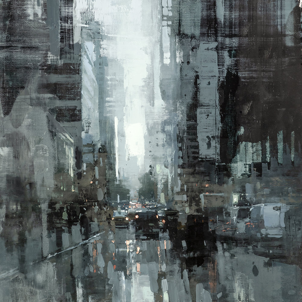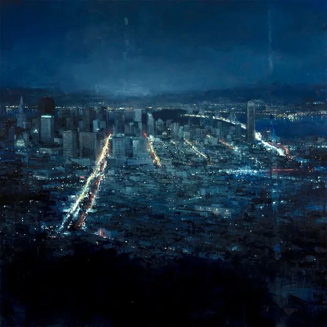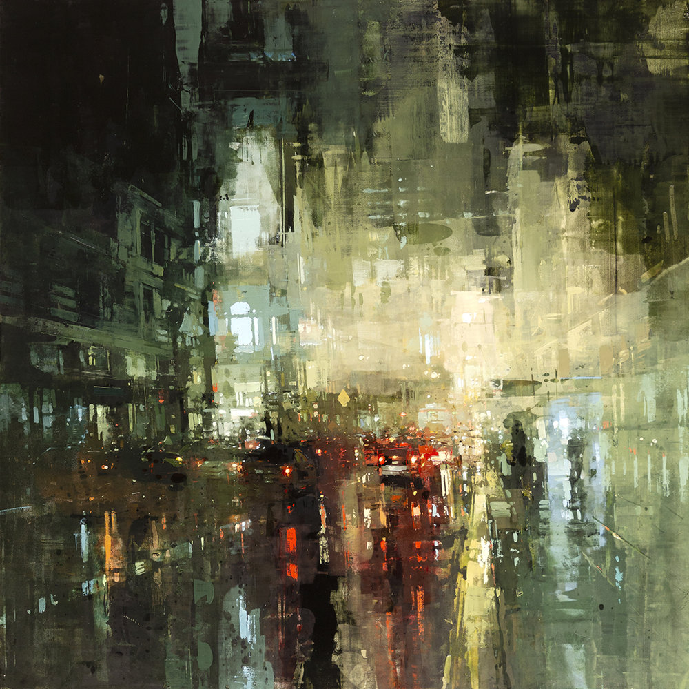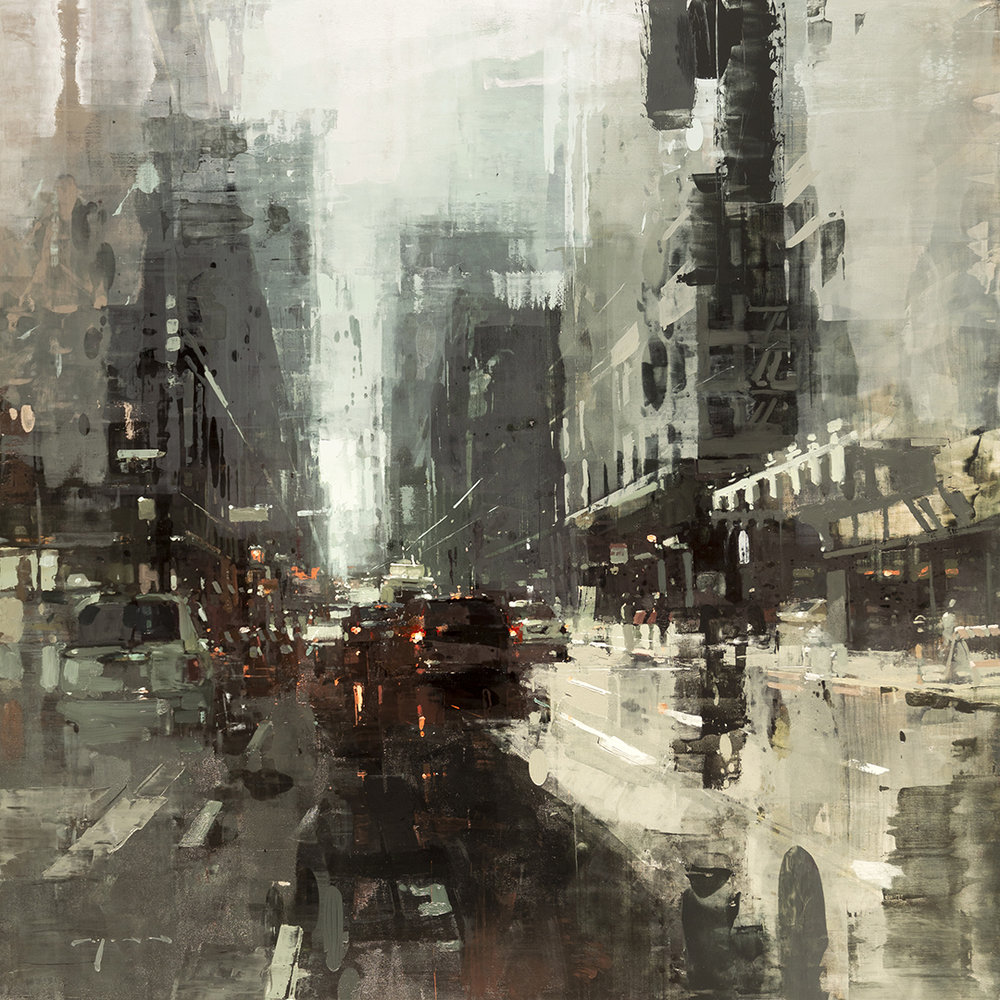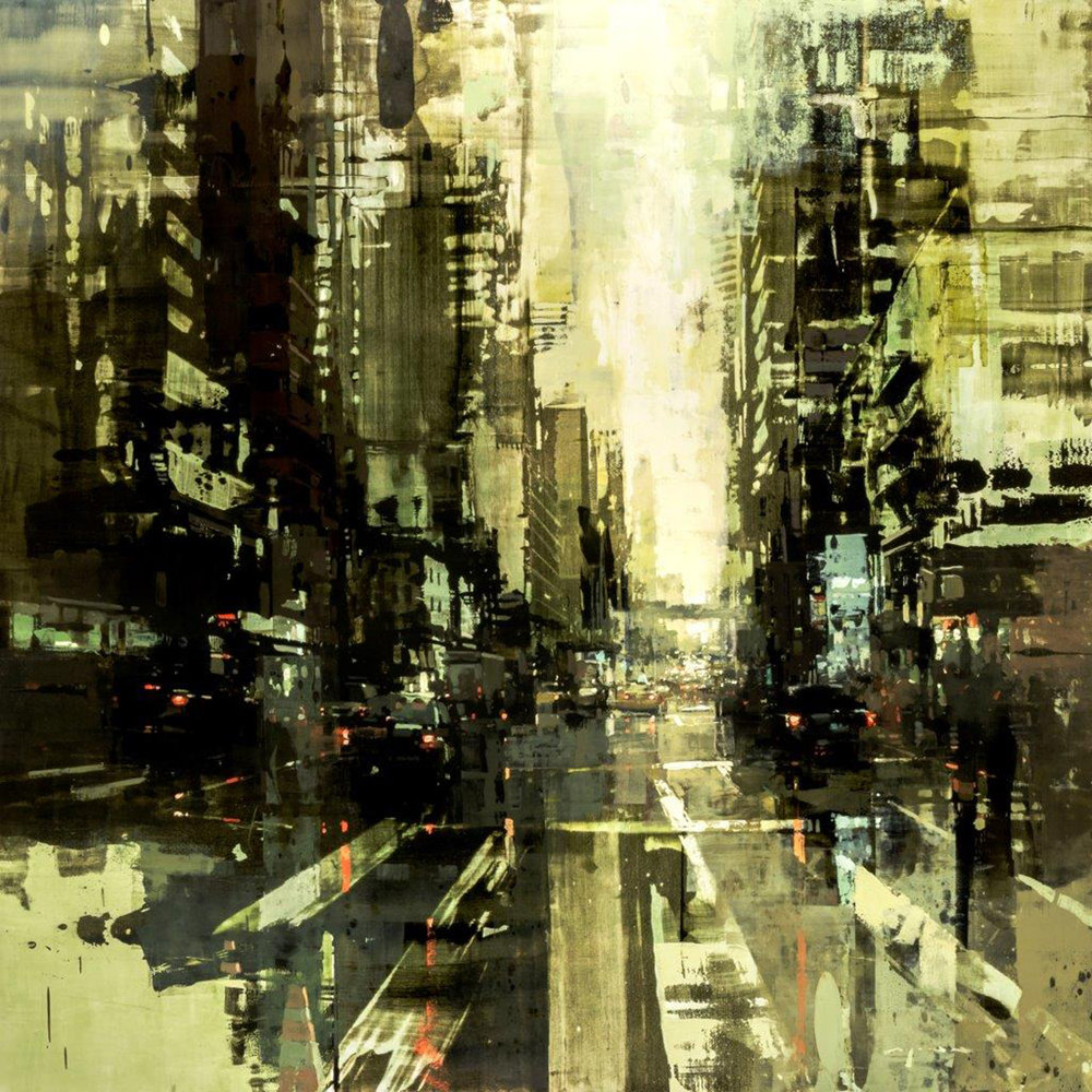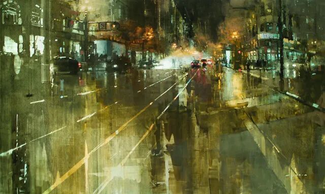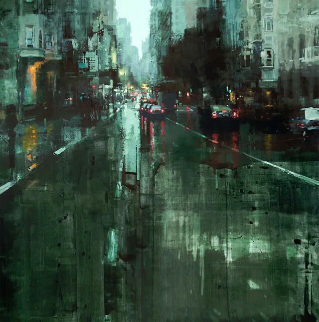 当他把一幅作品擦掉一大块,并没有破坏整幅画面的美感,反而让效果变得更好了。通过多种不同技法的融合,杰里米·曼的城市景观画作看上去非常有氛围感,虽然,他的画作总是让人感觉很朦胧,看不清楚,但整幅作品又带给人生动大气之感,他并不是在画一幅画,而是在营造一座充满情绪化和戏剧化的城市。