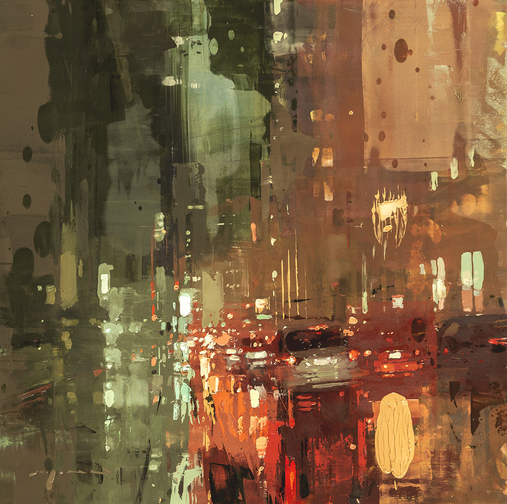 所以,杰里米·曼笔下的每一座城市、每一条街道都是独一无二的,都有自己的性格。如果你仔细观察他的作品会发现,每一幅画作中都有光源,有的是星星点点的灯光,有的是灯火通明的霓虹夜景,即便是隐在阴雨里和黑暗里,艺术家也会为它设置一抹光亮,让整个城市街道出彩,也让人们看到眼前的光亮。