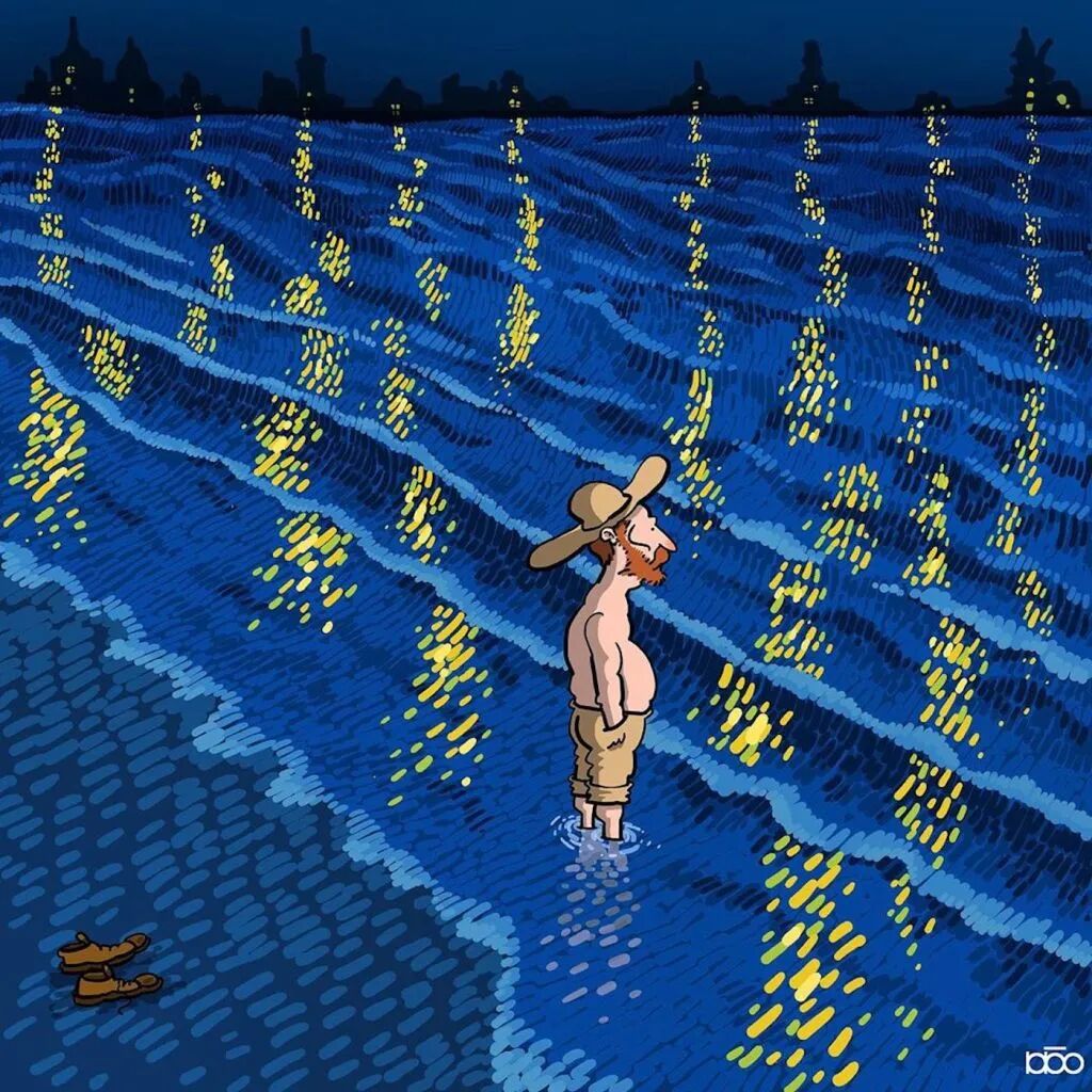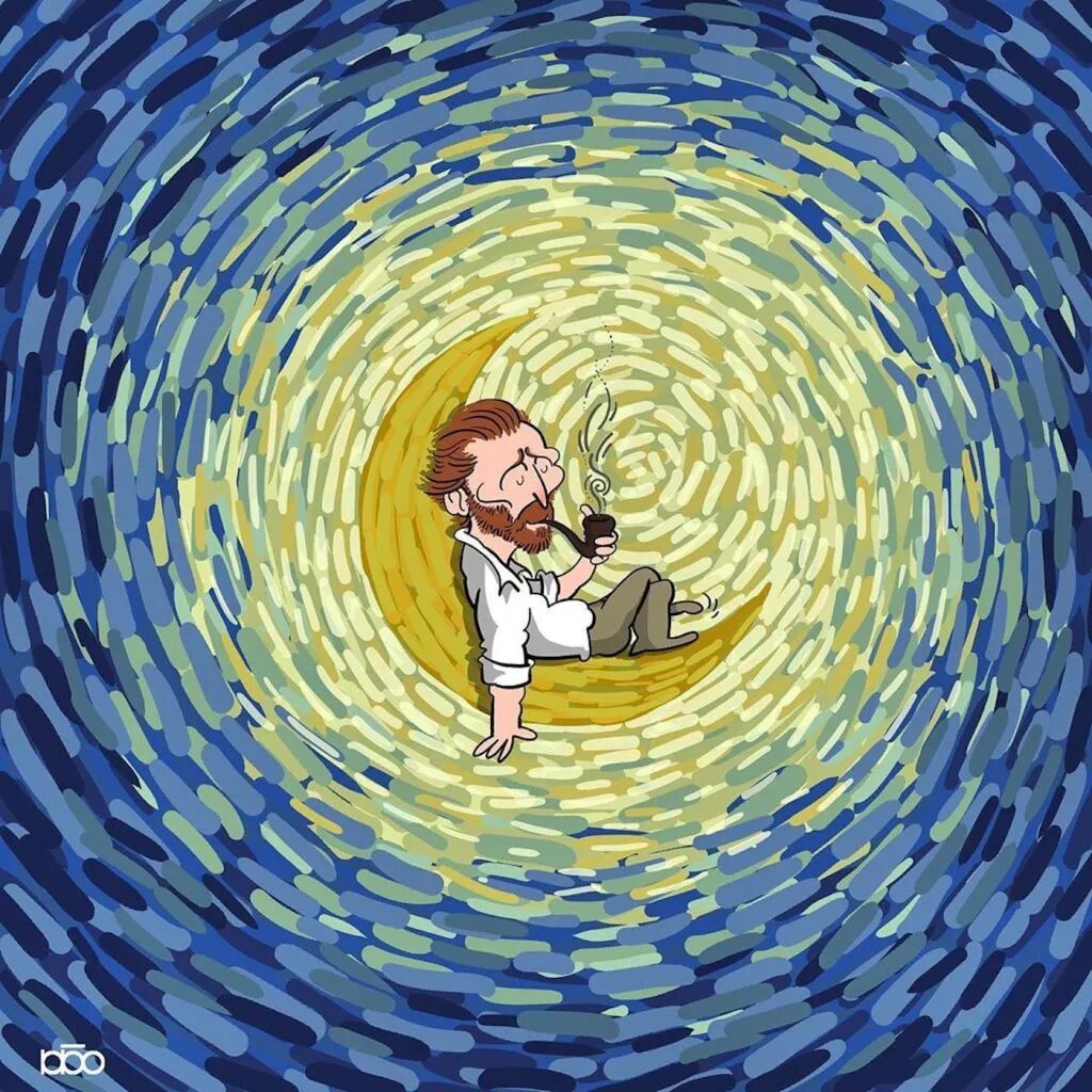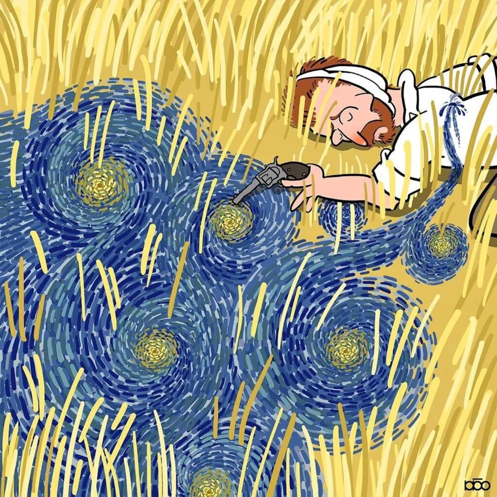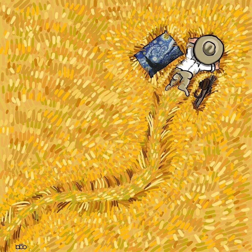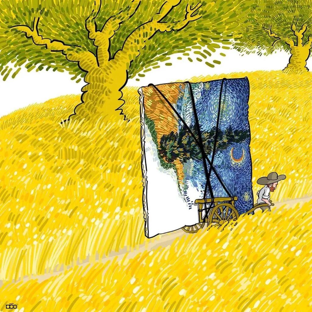 对于梵高这样的绘画大师,他的追随者也会有这样的心态,就有这样一位来自伊朗的插画家阿里雷扎·卡里米·莫加达姆,就通过一系列关于梵高的一生的插画,来表达自己对他的敬意。
