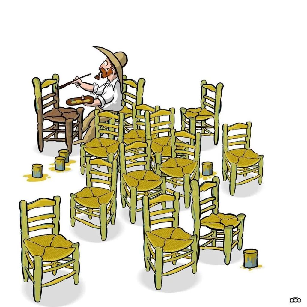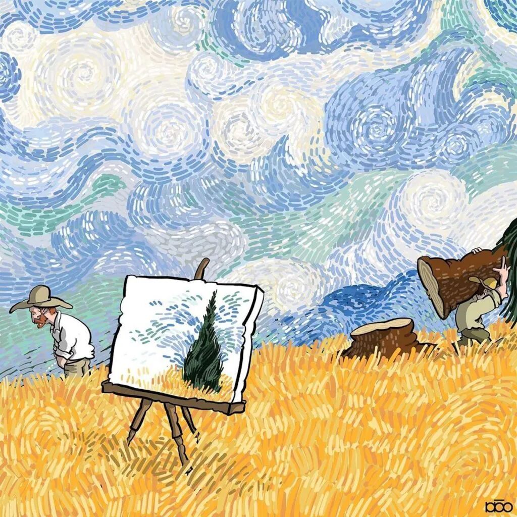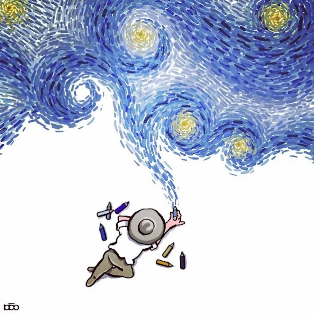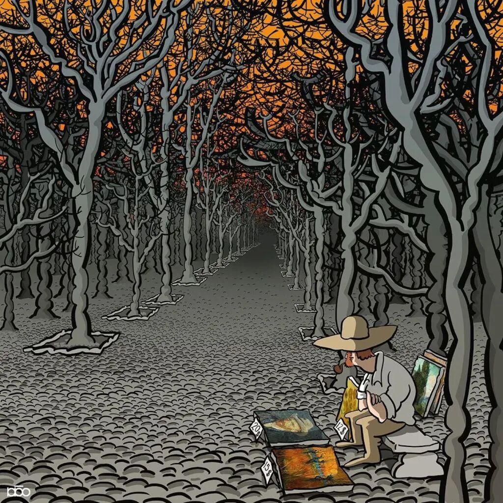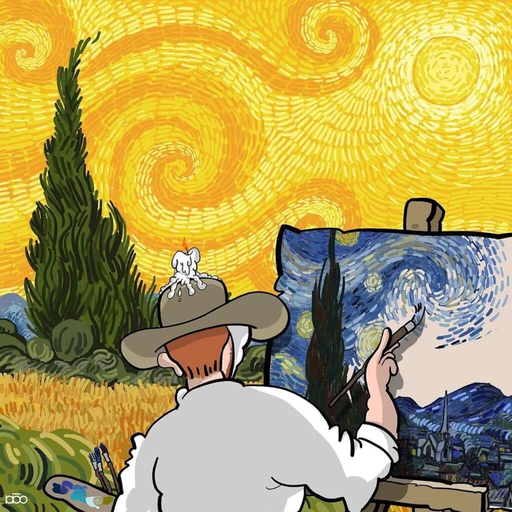 对于梵高这样的绘画大师,他的追随者也会有这样的心态,就有这样一位来自伊朗的插画家阿里雷扎·卡里米·莫加达姆,就通过一系列关于梵高的一生的插画,来表达自己对他的敬意。
