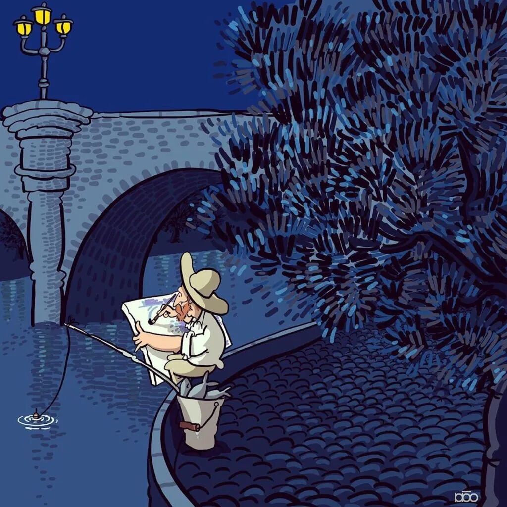 虽然,这些场景中的梵高,都是这位插画家自己想象出来的,关于梵高的日常生活,但是我们也能从中,看到更加丰富、立体的梵高,他的一生是否是这样的状态,是否过得开心充盈,没有一个现代人可以知道,那么,我们就借着这位插画家的作品,去感受和想象一下,这位绘画大师的日常生活吧。
