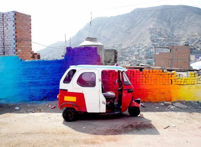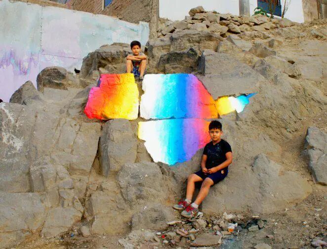 既然人们都喜欢彩虹,没有天然的彩虹,那么“人造”彩虹也足够给人们带来惊喜。来自匈牙利的艺术家卡马·雷纳,便在城市的很多地方,涂鸦了彩虹主题壁画,不管是街角、楼梯,还是墙体、石头,甚至,连人家院子里的交通工具,都被他涂上了彩虹一样斑斓的色彩,他似乎随身带着一个棱镜,走到哪里,就将七彩的光反射到哪里,说他是行走的彩虹形成器也不为过。
