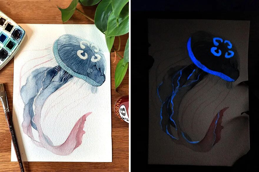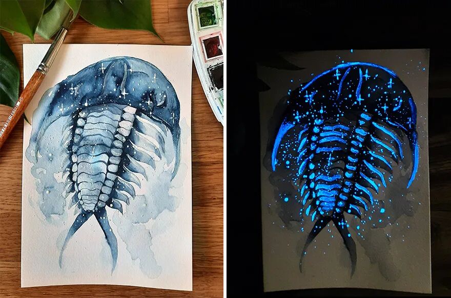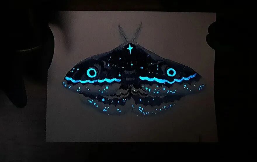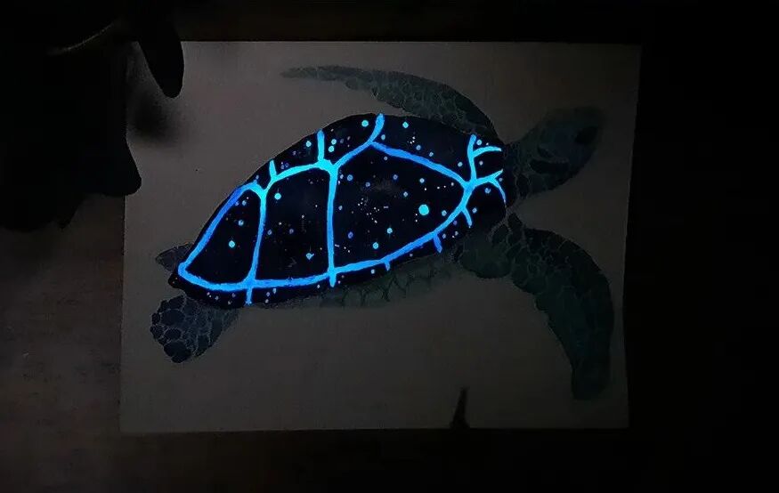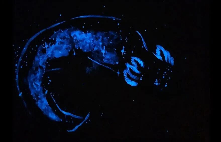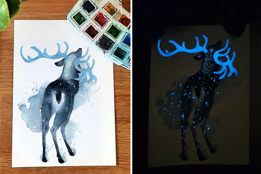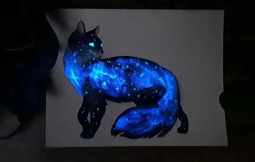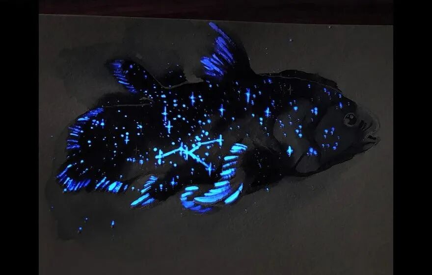 三叶就是利用这种特殊的颜料为她的星空动物,增加上荧光的特征,让她的画作变得非常迷人和梦幻,据三叶介绍,这些荧光颜料在补充满自然光后,可以发光12个小时。接下来,就让我们一起来欣赏一下这组特别的星空画作吧,相信你一定会喜欢的。