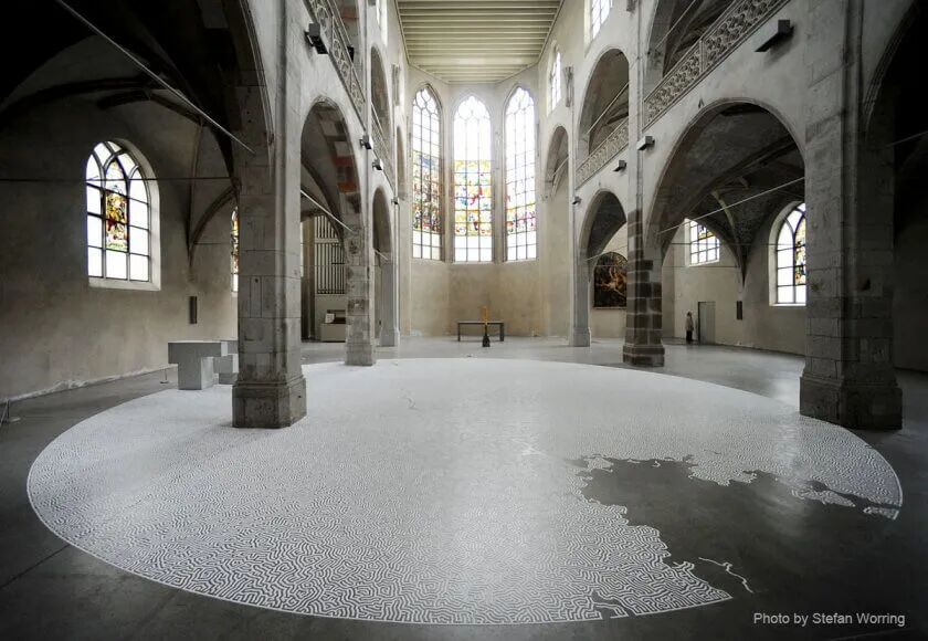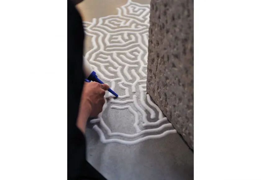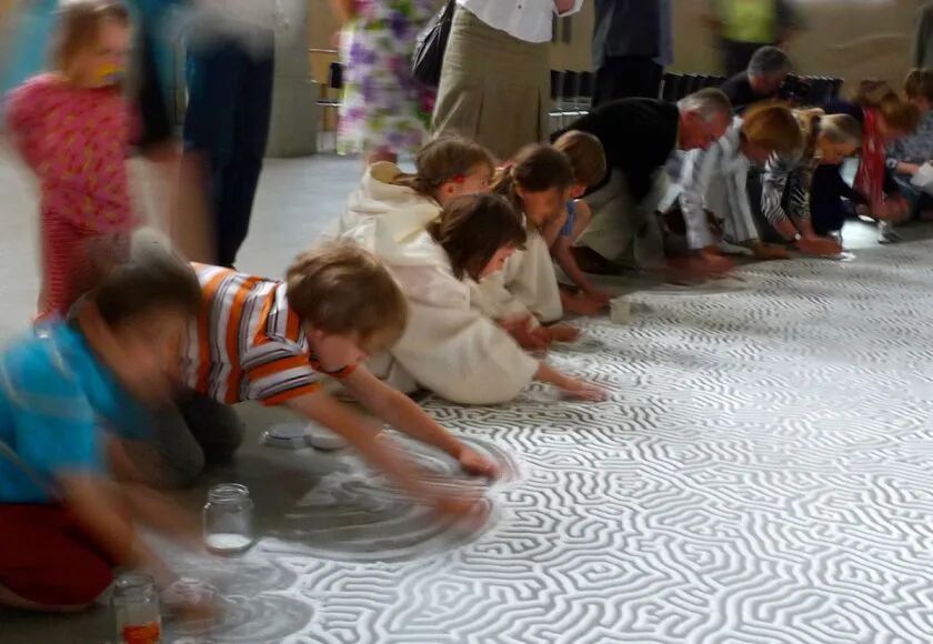 山本元井的“盐”画一般需要绘制几天,甚至几周的时间,在此期间人们可以欣赏他不断延伸的“盐画”,而创作完成后,山本元井会邀请观众,一起毁掉这个作品,并将它倒入大海。