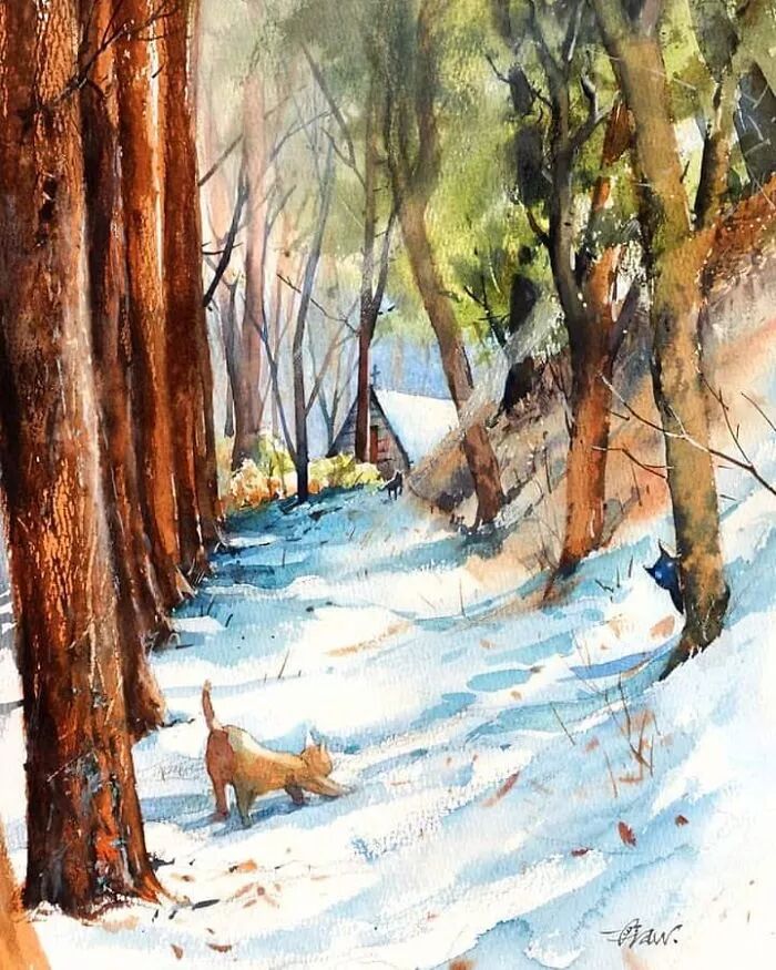 下雪的时候,是主人最兴奋的时候。她会鼓励我出去玩耍,然后把我和雪景画在一起。虽然室外有点冷,但是看主人开心地笑脸我就知足了。