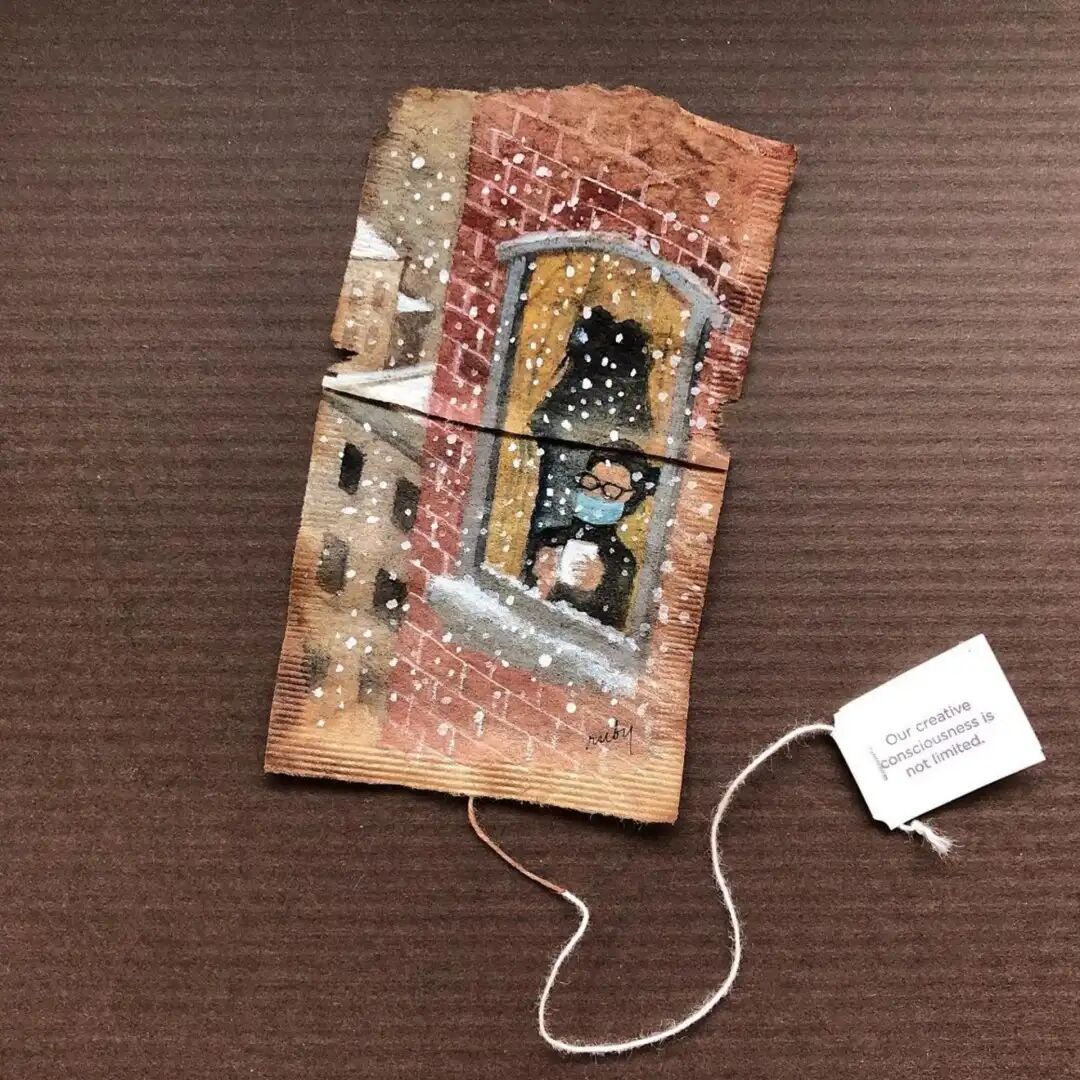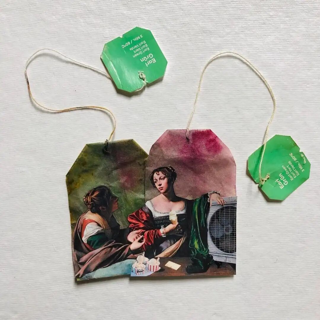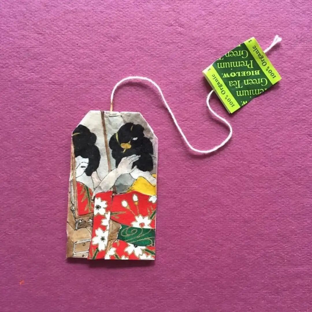 接下来,我们一起看一下这位美女艺术家创作的精彩的茶包画吧,下次泡完茶后的茶包不要丢掉,你也可以尝试在上面画一画,体验一把塞尔维斯画画时的感觉。