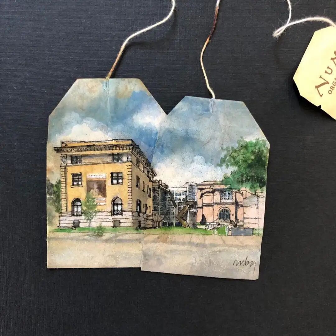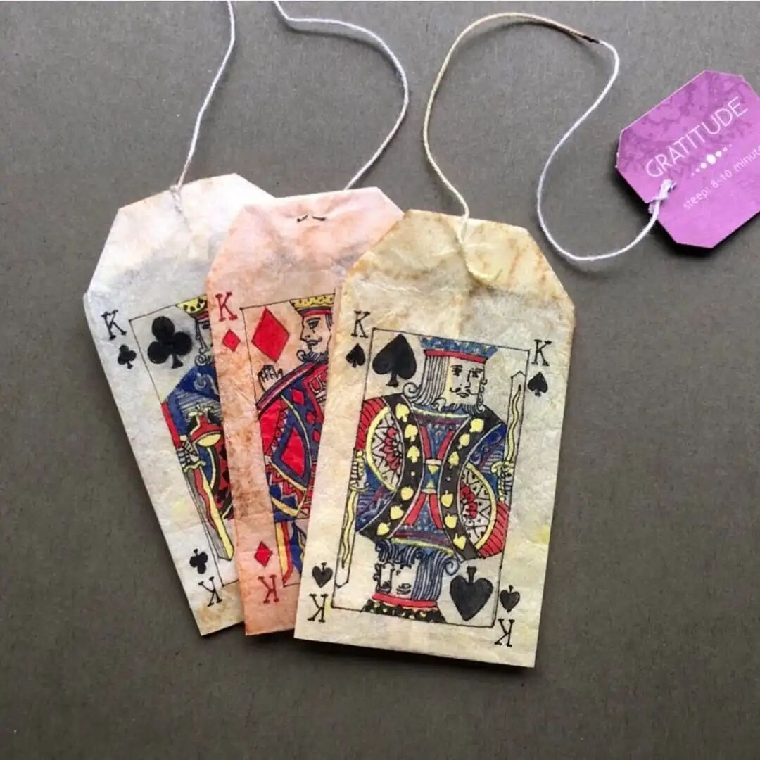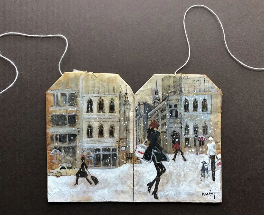 接下来,我们一起看一下这位美女艺术家创作的精彩的茶包画吧,下次泡完茶后的茶包不要丢掉,你也可以尝试在上面画一画,体验一把塞尔维斯画画时的感觉。