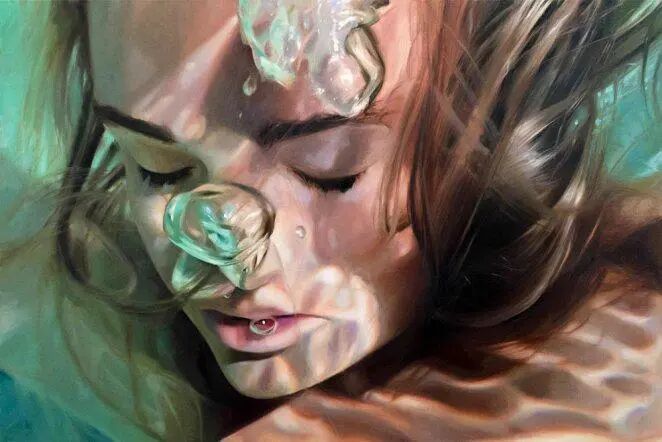 瑞莎·帕尔穆特是一位懂得操纵光线的艺术家,她的超写实画作以光影为能量源,光源在起伏的水中移动,当光出现在水面上,水中泛起的涟漪都变得温柔了,当光折射到水下,打到女性的脸上,那种柔美感让人看了忍不住心动。