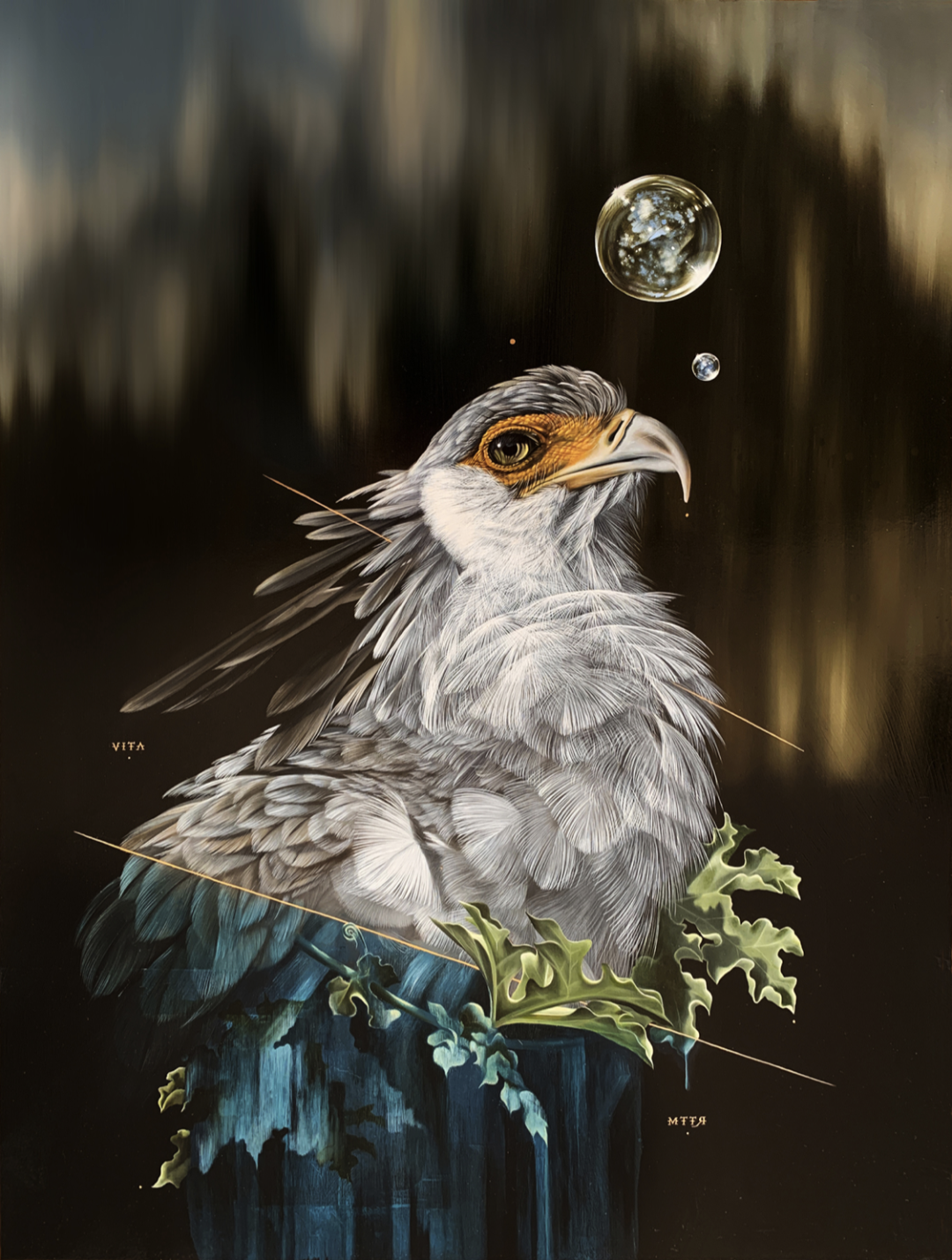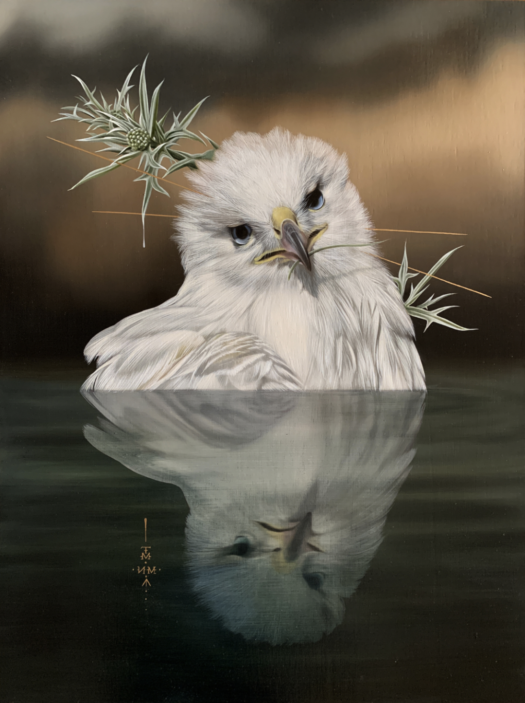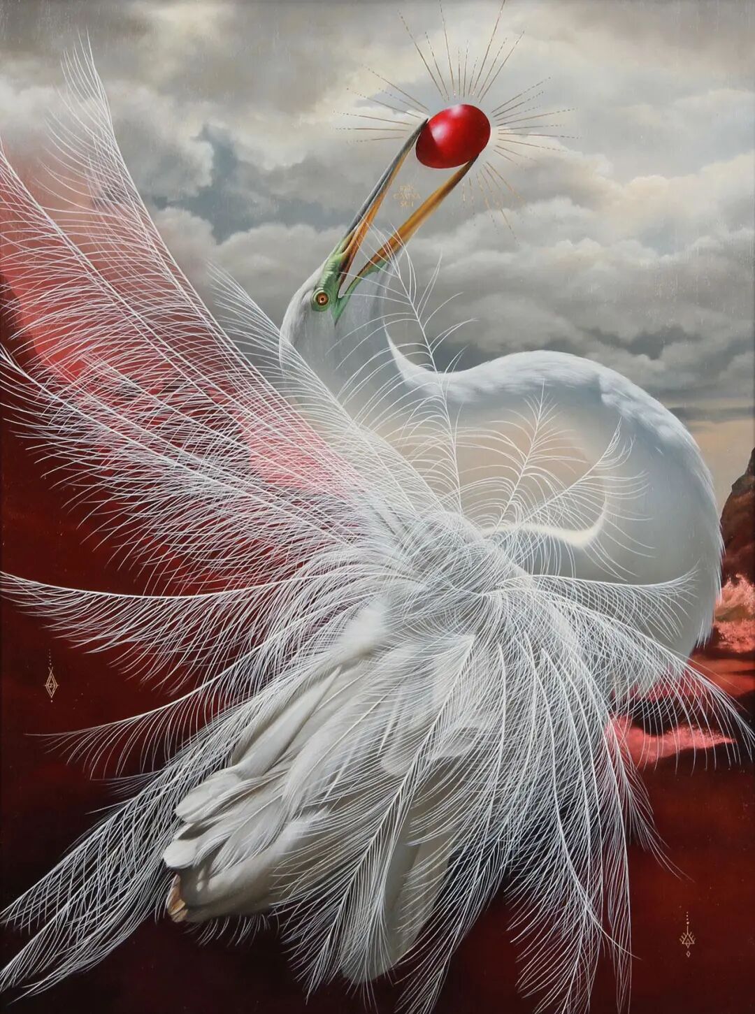 这位超现实主义画家的作品,主要以鸟类题材为主,配合植物元素和神秘的符号,让这些作品神秘感直接拉满,快速吸引住观众的目光,画作的细节也非常耐看,每一根羽毛、每一片花瓣和叶子都十分精细,一幅画作往往需要几个月的时间才能完成。随着绘画的熟练,她可以同时绘画多幅作品,因为需要等待油彩干燥,一幅画从开始到结束的时间并不会减少。