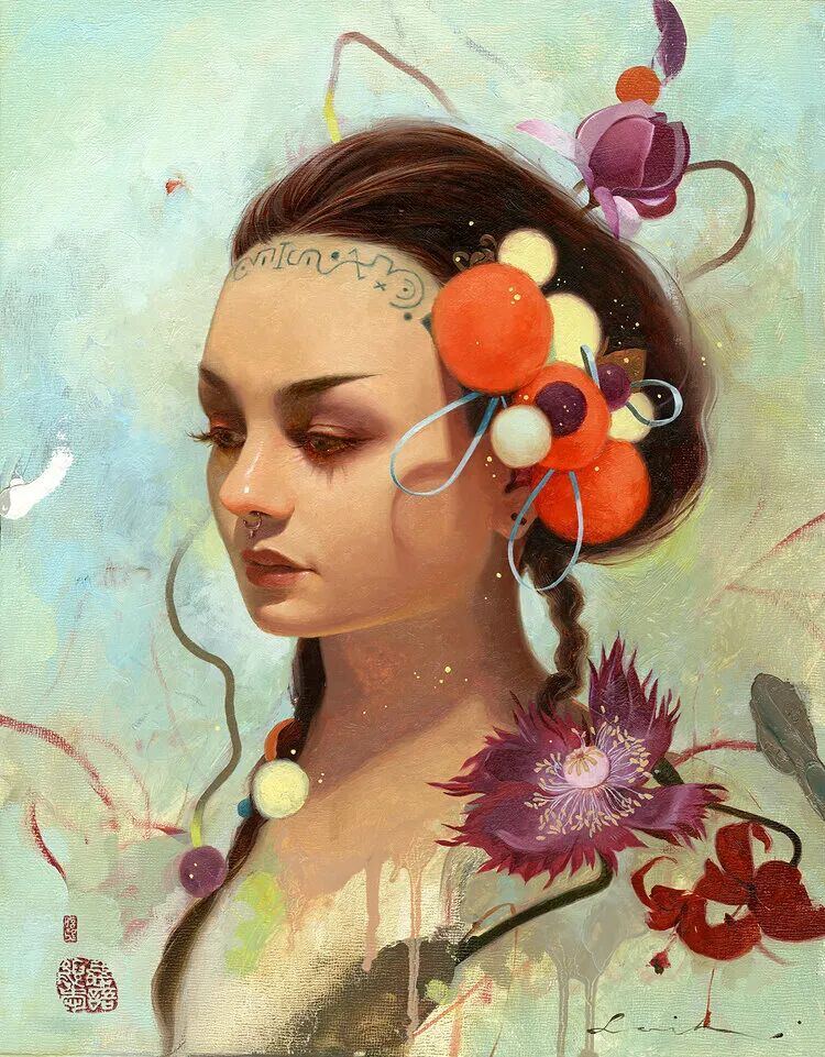 豆浆的油画作品,以其华丽的色彩与超现实的场景被人们熟知,在她作品中我们可以看到非常精彩的女性人物,在女性人物周围布满了花朵,紧凑的构图和精细的描绘,引人入胜。