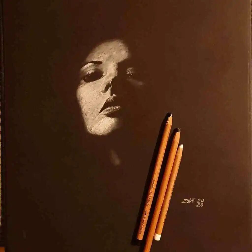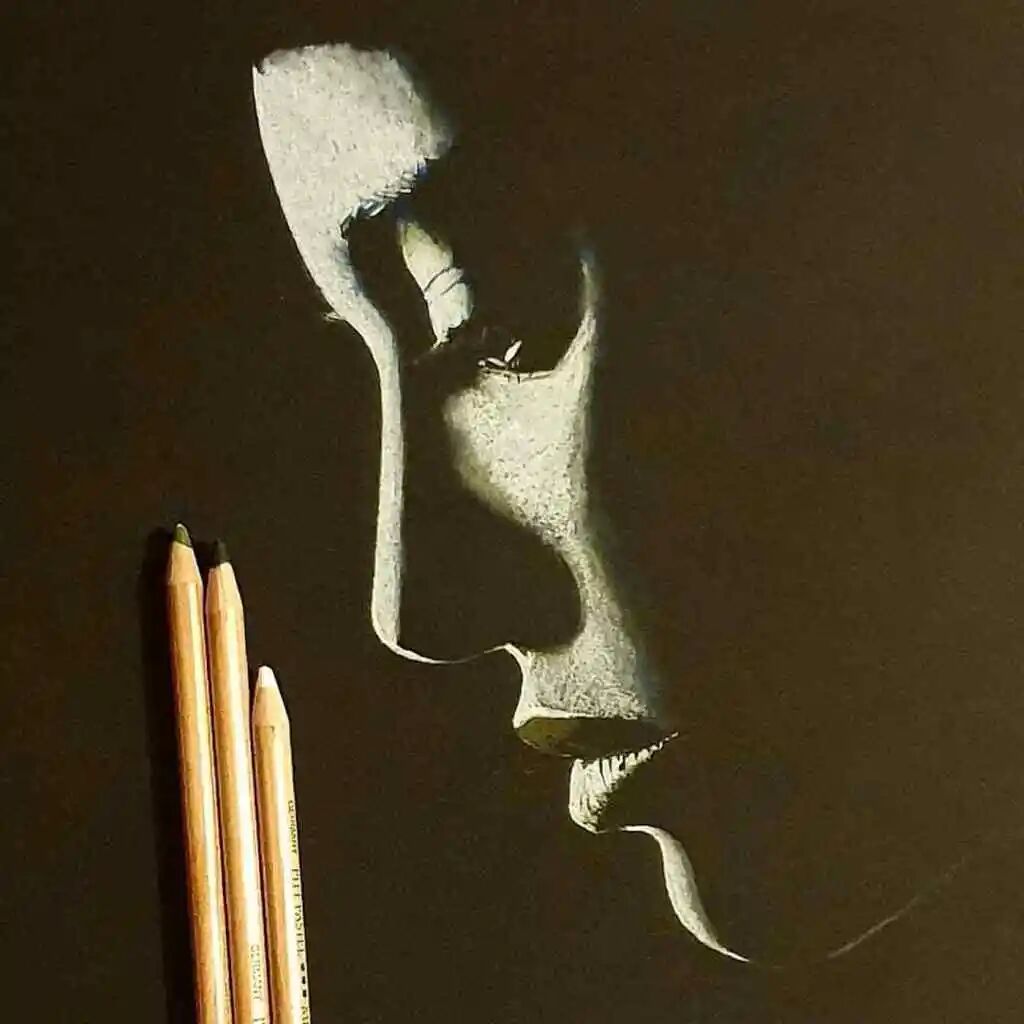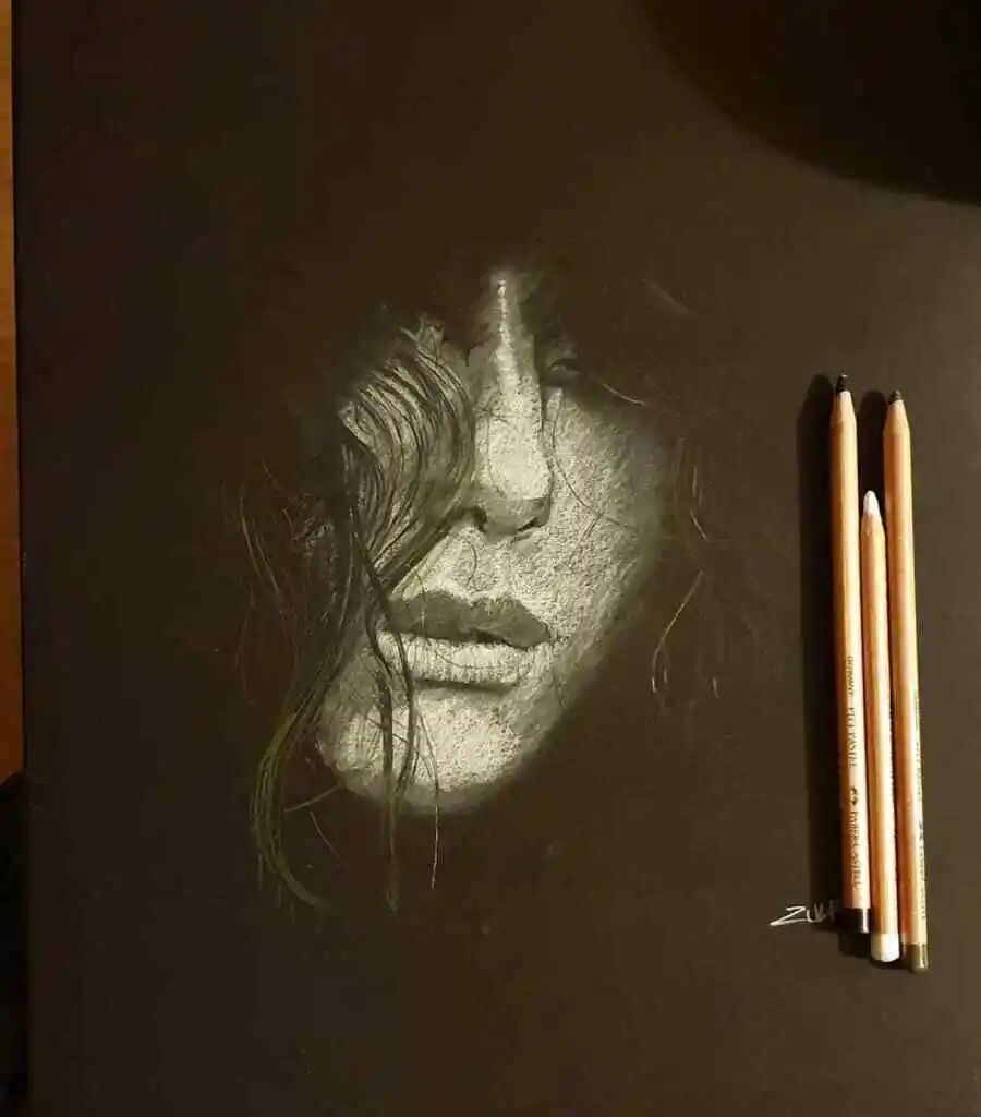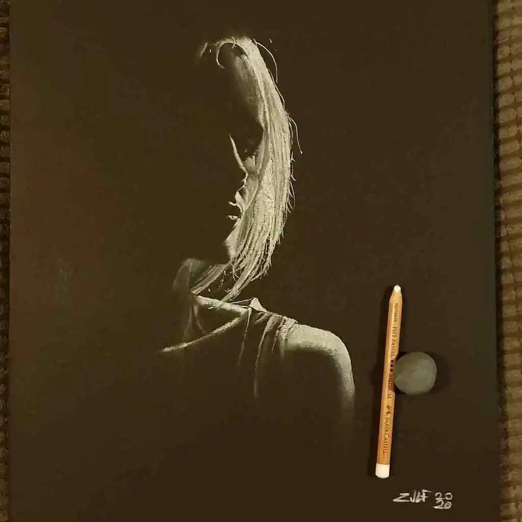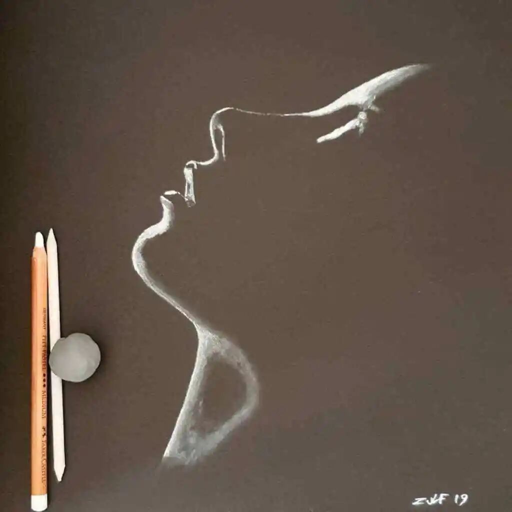 艺术家祖弗就是这样一位不走寻常路,喜欢迎难而上的人,他挑战用白色的炭笔在黑色的纸上画肖像画,光与影的巧妙融合之后,显示出人物的神秘面孔,带给人一种梦幻的感觉,这样的作品,并不是换一种颜色的纸笔那么简单,还需要特殊的绘画技巧,艺术家除了要知道用合适的颜色来表现阴影和人物的肌理之外,还必须掌握人物的比例和情感的表达。