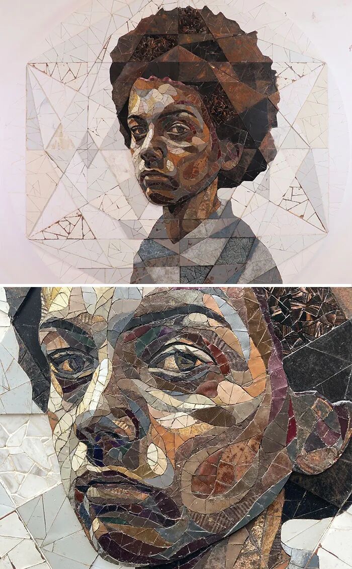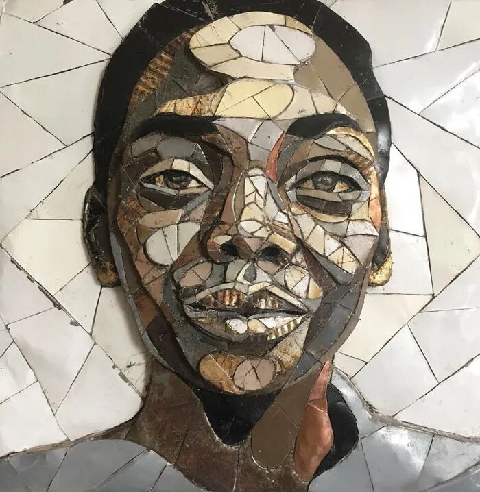 前面说到不同材料的区别,马特·斯莫尔就是利用这些区别去完成一幅肖像画,他会将金属材料进行切割,然后再将它们拼凑起来,就像是拼贴马赛克一样,根据深浅和浓淡,形成光影与轮廓,最终完成一幅金属肖像画作,一幅作品往往由近百块不同的金属材料组成。