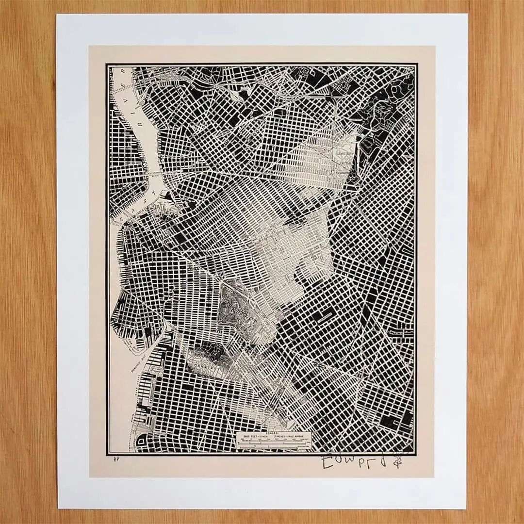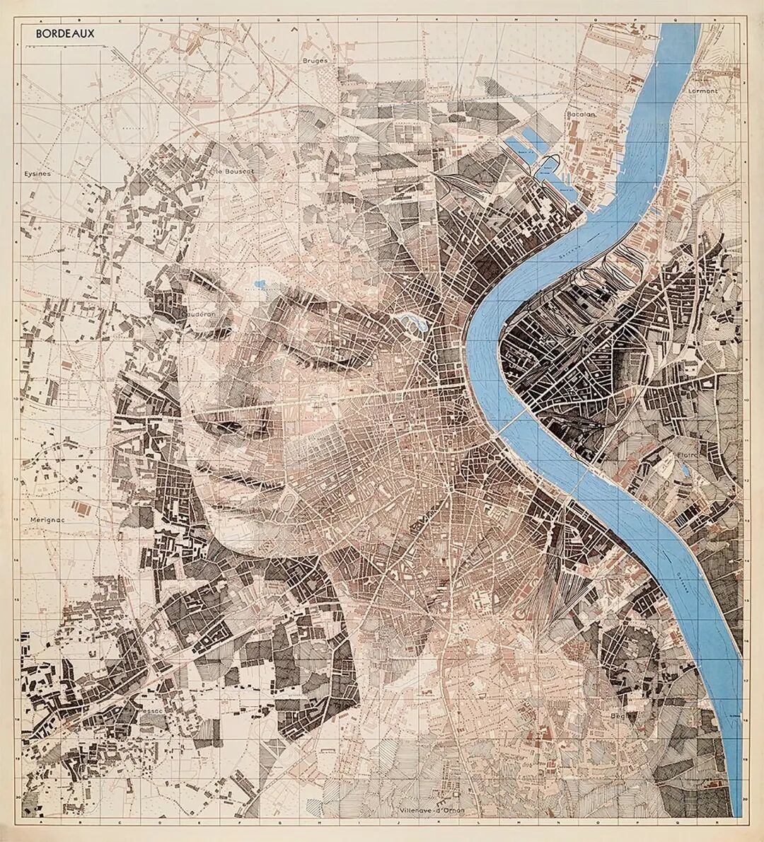 这位画家使用的颜料普通,以铅笔和墨水为主,在最近一段时间,这位画家又绘制了一系列新的作品,这些新作品同样是在使用过的纸张上绘制而成,区别则是,这次使用的纸张是废弃的地图,这些地图有城镇地图,也有区域地图。