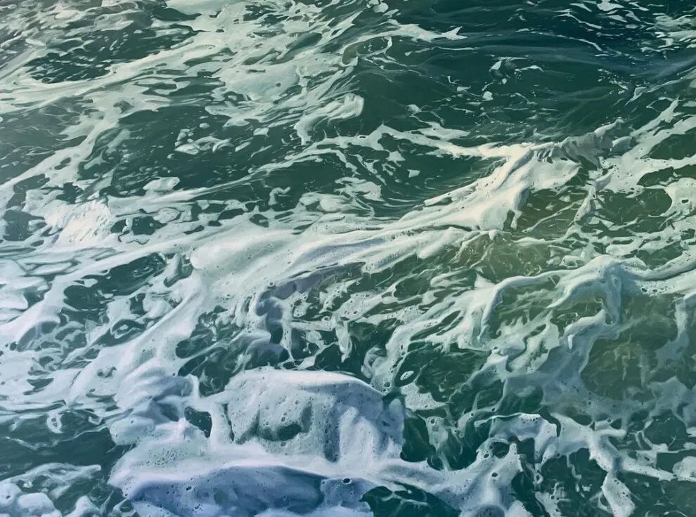 在这位画家的绘画作品中,我们几乎看不到地平线,目光所及的范围都是海水,这些海水或是平静,或是翻涌溅起浪花,画作中的内容除了海水之外还是海水,至于为什么一幅画中全部描绘海水,用这位画家的话来说就是,这样绘制的目的,就是为了让欣赏者沉浸在画作中,去欣赏画作中海水的细节,在运动中的海水中,或许某一个浪花、一个泡沫,一些色彩上的变化,就能让人们发现细节中的美,去仔细品味它们。