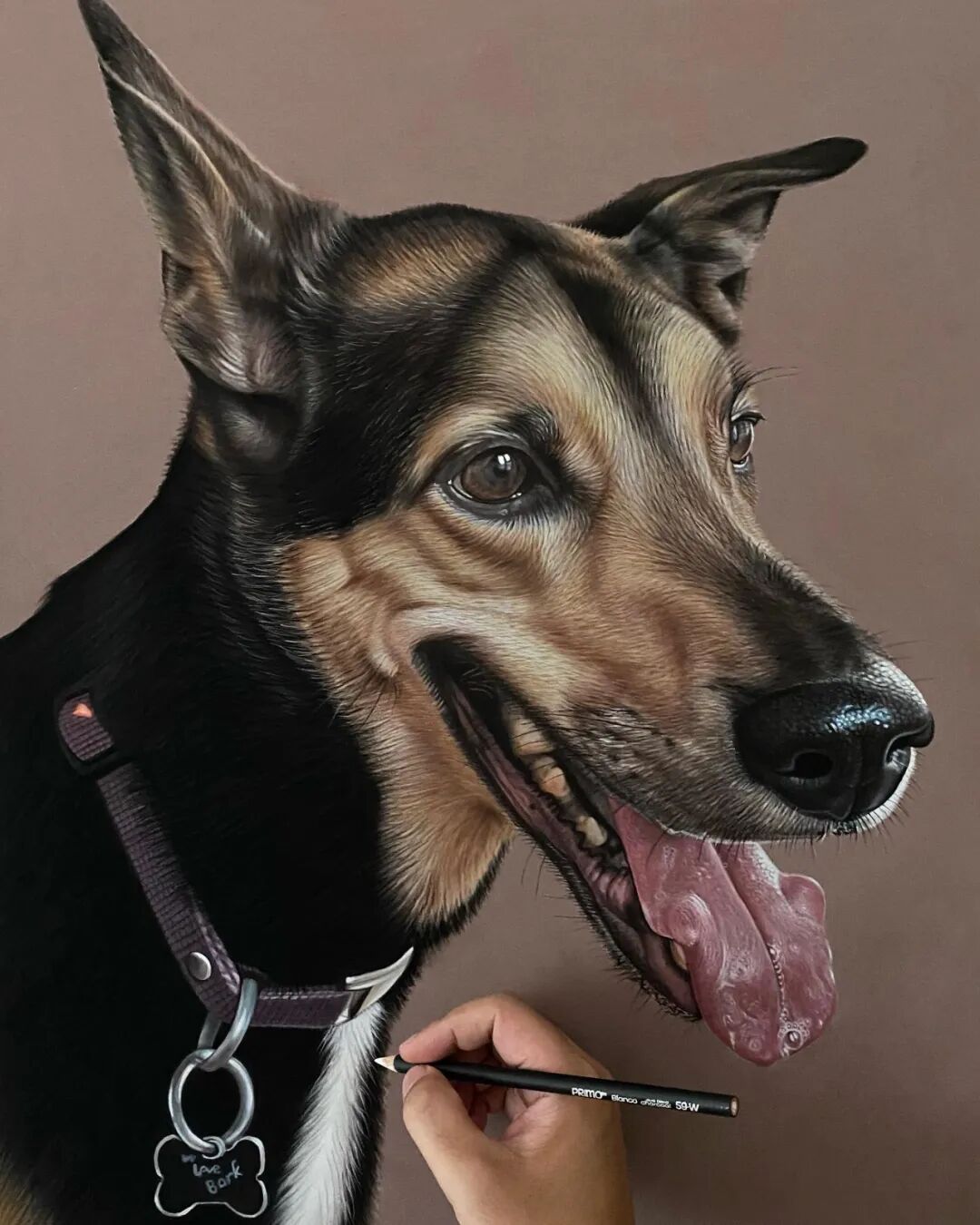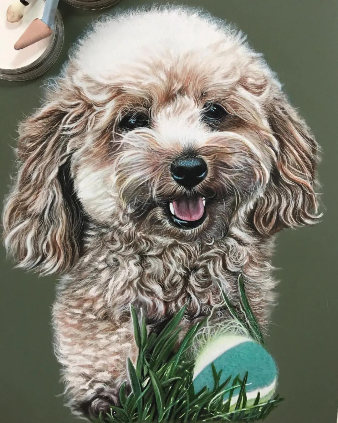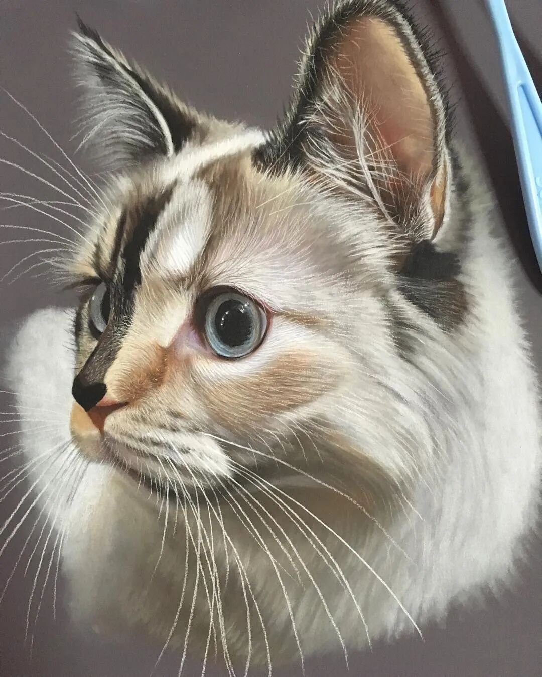 为了突出宠物的温和,伊万·胡会使用比较柔和的色彩来表现它们,在处理动物的毛皮时,我们也能看到,他十分专注于细节的刻画以及质感的呈现。一幅宠物画作,这位艺术家一般要画上一周左右的时间,因此,最终效果都会让人感觉十分震撼,画中的动物看起来鲜活灵动,栩栩如生。